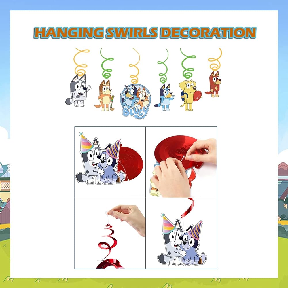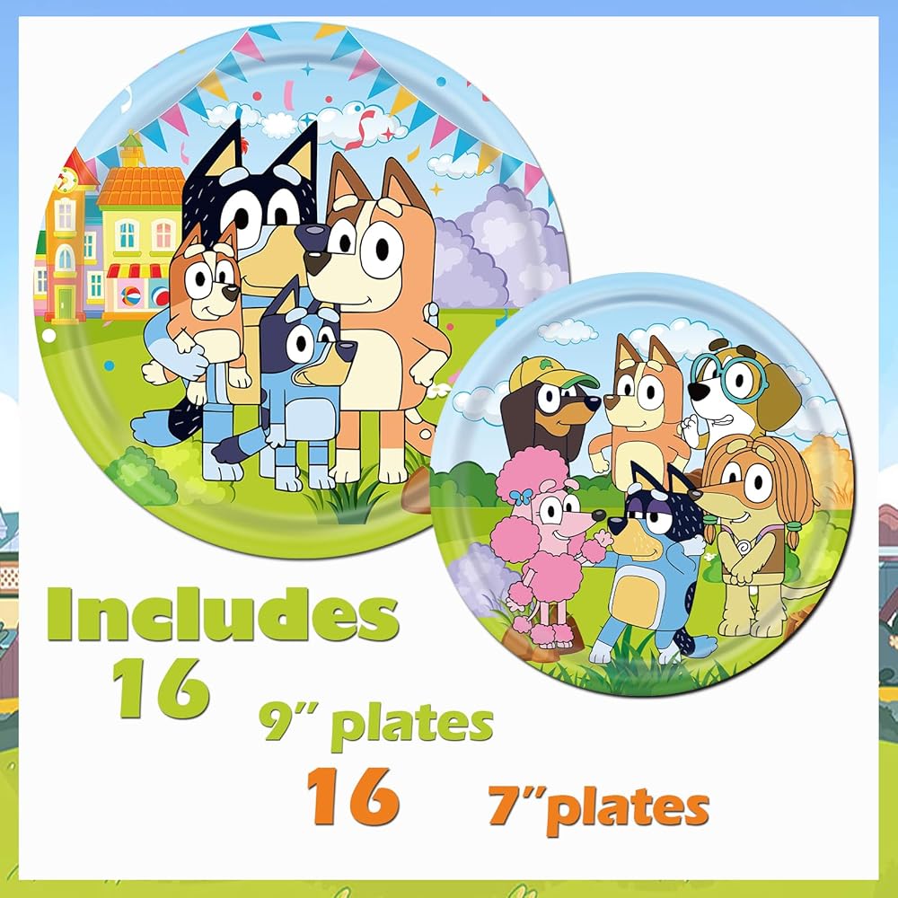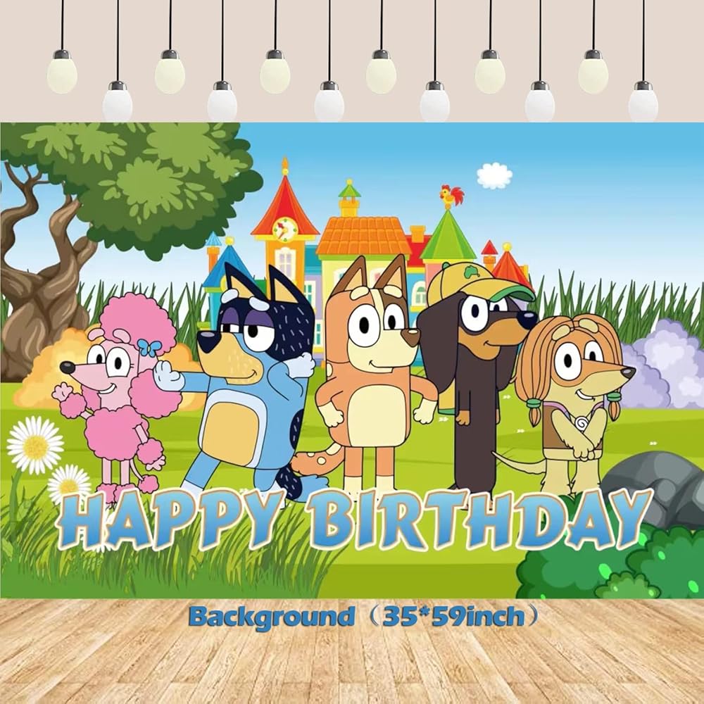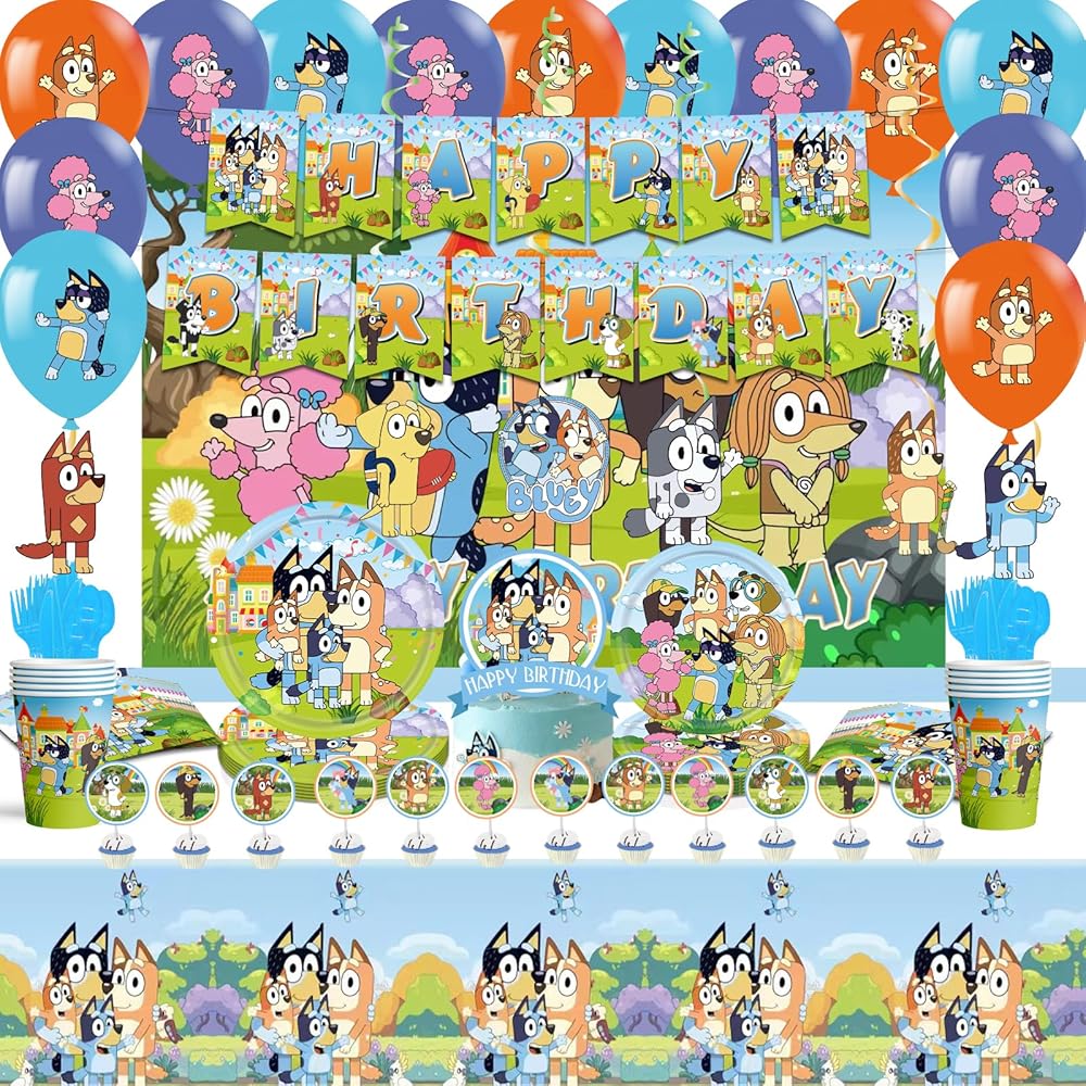 Blue Birthday Party Supplies, Blue Dog Party Decorations Pack Includes Party Backdrop,Banner,Swirls,Cake Topper,Cupcake Topper, Latex Balloons, Tablecloth ,Tableware for 16 Guests