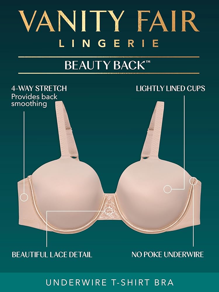 Our bestselling beauty back full figure underwire bra has a unique 4-way stretch fabric that smooth's the back for a sleek look with no bumps or lines. Seamless sides and an invisible neckline offer a smooth look under your favorite t-shirts and silky blouses. Lightly lined contour padded cups provide the coverage you need for all day comfort without adding bulk. The signature honeycomb straps are adjustable on the back to ensure the perfect fit. Choose the beauty back full figure underwire bra and look and feel fabulous!.