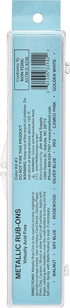 CRAF-T PRODUCTS-Metallic Rub-Ons: Color Kit #3. Simply use your with these rub-on colors. They can be used on heavy card stock wood glossy paper clay ceramic and many other craft surfaces. 7 colors included in this flip-top case. Conforms to ASTM D 4236. case measurements: 1-1/2Lx7-1/2Wx1/2D inches. Made in USA.