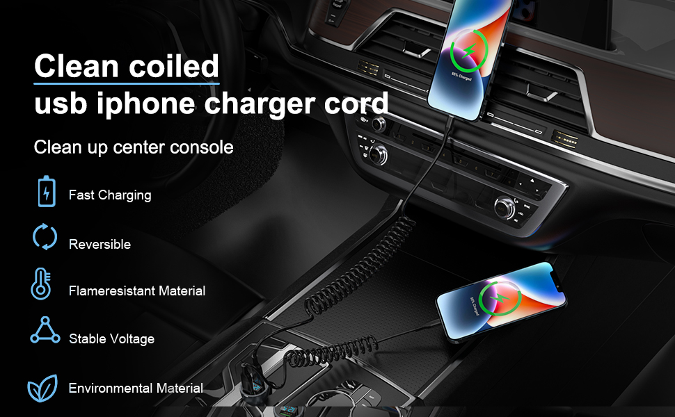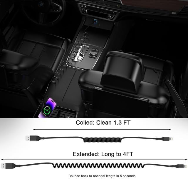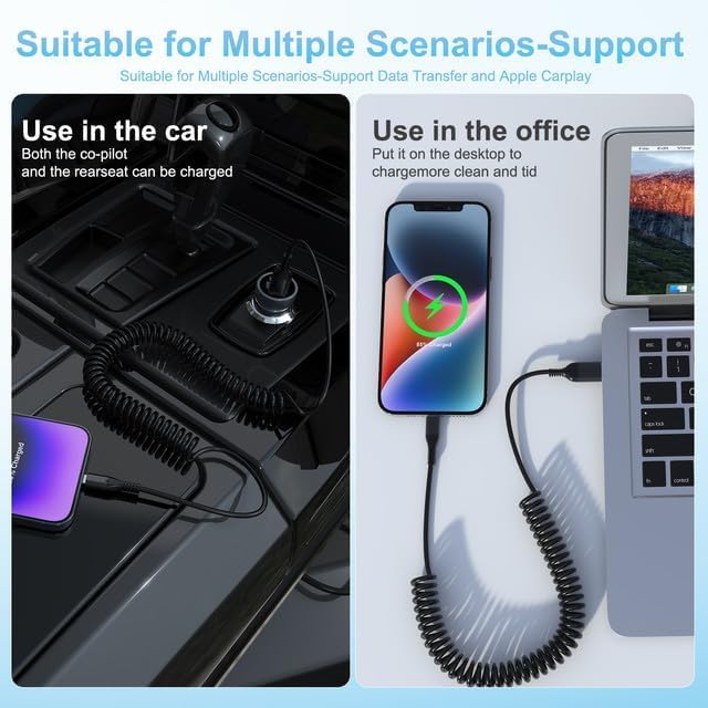 【Fast Charging & Data Sync】The coiled charging cable can support fast charging up to 2.4A. Provides security for your device. This car charging cable also supports data transfer speeds of up to 480Mbps, making it easy to transfer music, photos, videos and files in seconds. Note: Not for CarPlay.
