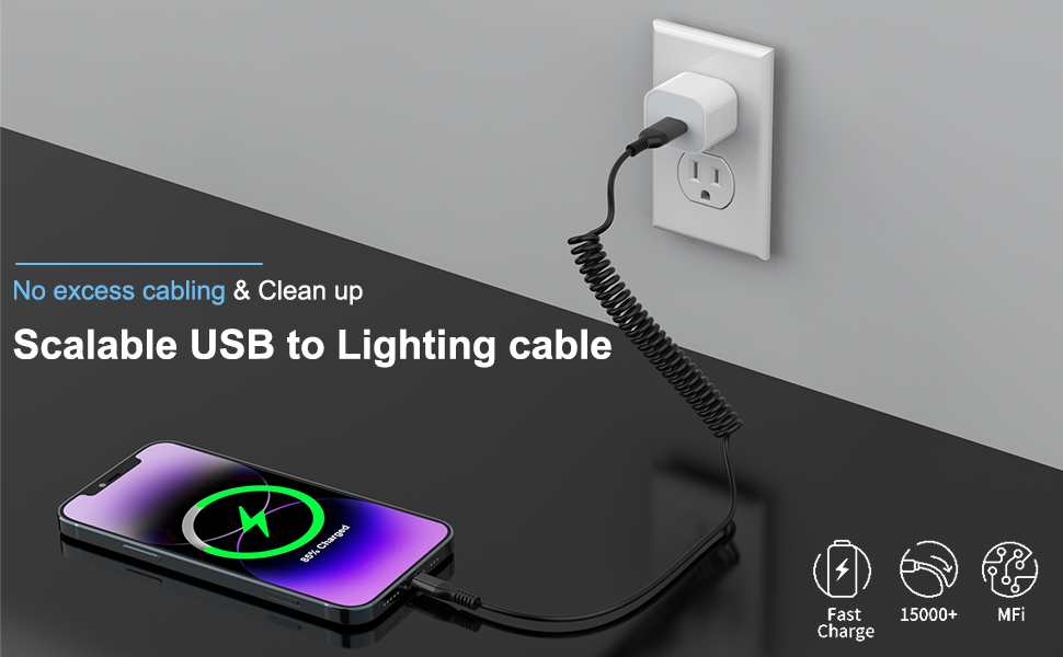 【Elastic Coiled iPhone Charger Cable】The coiled lightning cable with length stretchable from 1.3FT to 4FT will be a perfect iphone charging cable for car. Stretchy and flexible coiled cable for your car or home or office. The coiled iPhone cable can easily be extended to the dash mount, air vent mount, and even the backseat, make your car/home or offine more clean.