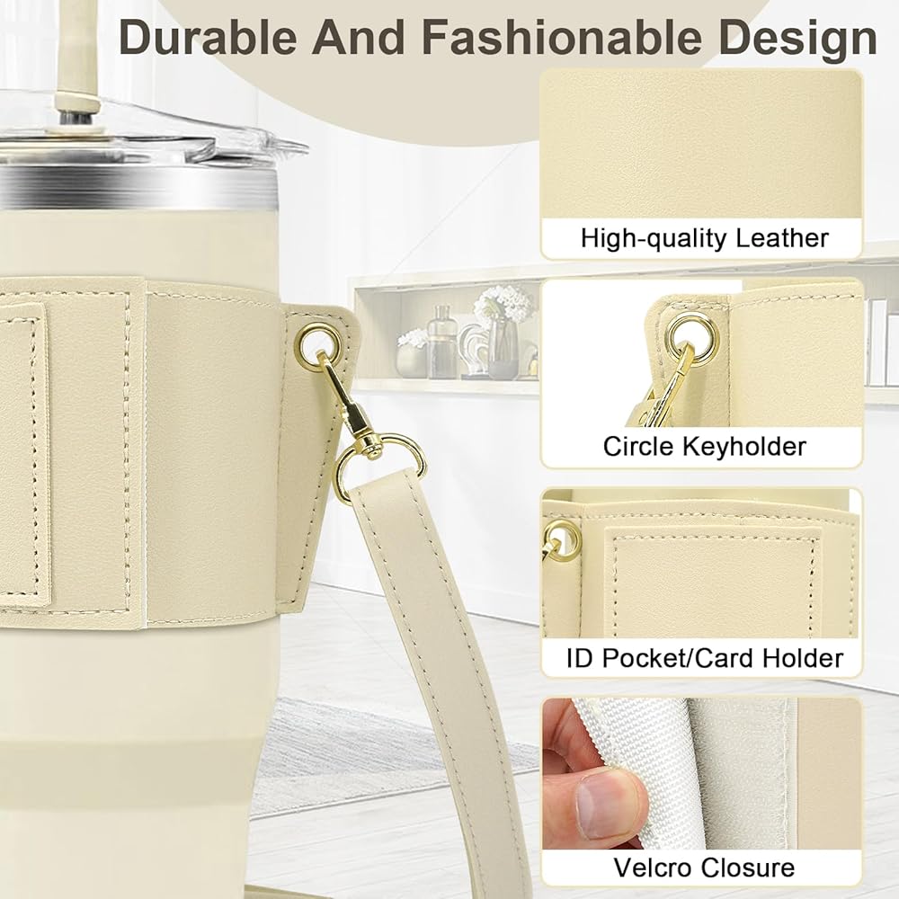 Water Bottle Holder for Stanley Tumbler with Handle, Leather Carrier Strap for 40 oz 30 oz Stanley Cup Accessories, Water Bottle Carrier with Adjustable Strap, Card Holder, Keyring (White)