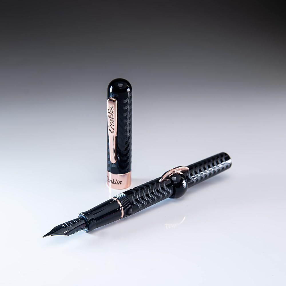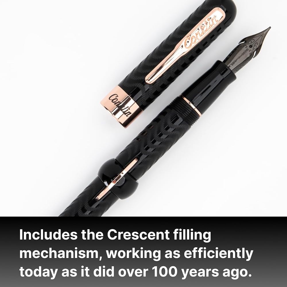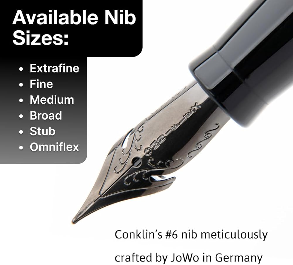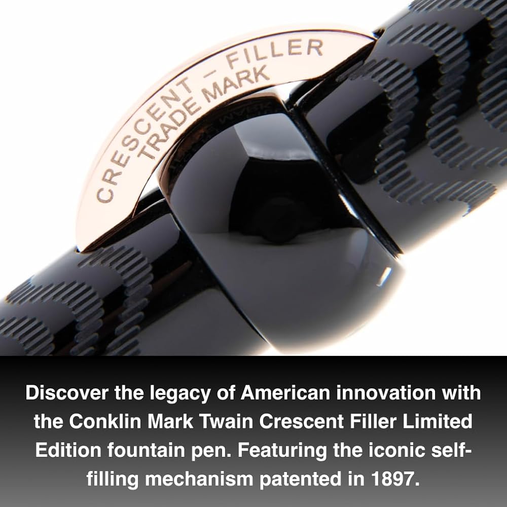 The Conklin Pen Company® changed the writing industry forever when it patented in 1897 the self-filling pen known as the Crescent Filler™. Soon recognized and hailed by legendary author Mark Twain, Conklin® thrived and Crescent Fillers™ became one of the most beloved pens in American history. In honor of its continued success, the Conklin Pen Company® is proud to announce the latest within the stellar collection: the Limited Edition Crescent Filler™ Gunmetal. Keeping true to the original style and design, this all new Crescent Gunmetal features an exclusive twist. Using plating along the length of the barrel and cap, this captivating writing instrument displays an eye-catching mix of metallic dark hues. Each Crescent Filler™ Gunmetal is truly exceptional, and paired with polished gunmetal trims and segments of durable black resin along the grip and locking ring. Each pen is engraved with Mark Twain's distinctive signature along the band and is equipped with the original Conklin® spring loaded rocker clip patented in 1916. Tastefully engraved along the bottom of the cap is the limited edition number exclusive for each pen. The Crescent Filler™ Gunmetal is a limited edition run of 1898 pieces and is available in a choice of JoWo black steel nib grades: Extra Fine, Fine, Medium, Broad, Stub, or OmniFlex.