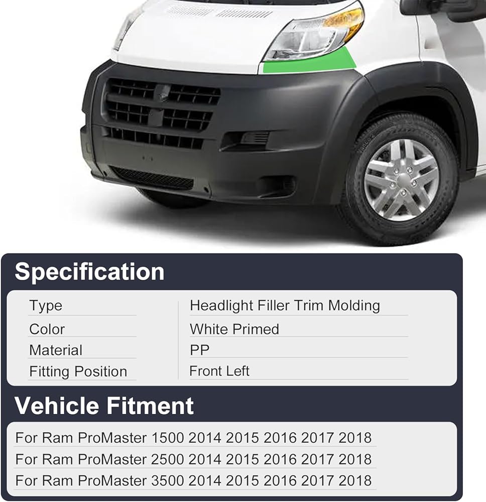 Lower Headlight Filler Trim Headlight Lamp Bezel Trim Molding White Primed Compatible with RAM Promaster 1500 2500 3500 3.0L 3.6L Cargo Van 2014 2015 2016 2017 2018 1ZT60ZZZAA