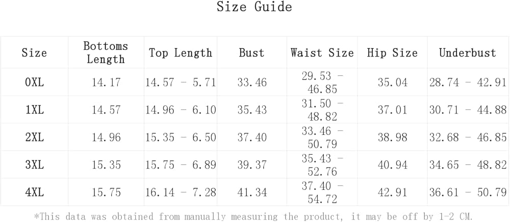 0XL:Bottoms Length:14.2IN,Hip Size:35.0IN,Waist Size:29.5-46.9IN,Bust:33.5IN,Top Length:14.6/5.7IN,Underbust:28.7-42.9IN
