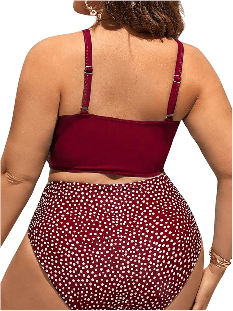 WDIRARA Women's Plus Size Spotted Print Vest Style Swimsuit Criss Cross Ruched Tankini Top and High Waist Bottom Bikini