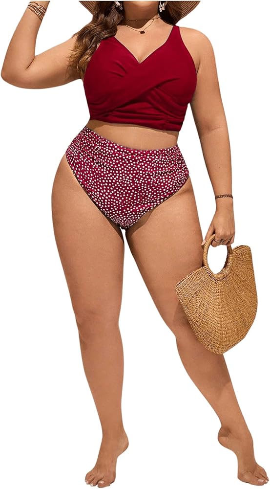 • Features: plus size, vest style tops, wireless, straps, criss cross, ruched, v neck, spotted, polka dots, all over print, high waist ruched bottom, beachwear, swimsuit bikini, casual