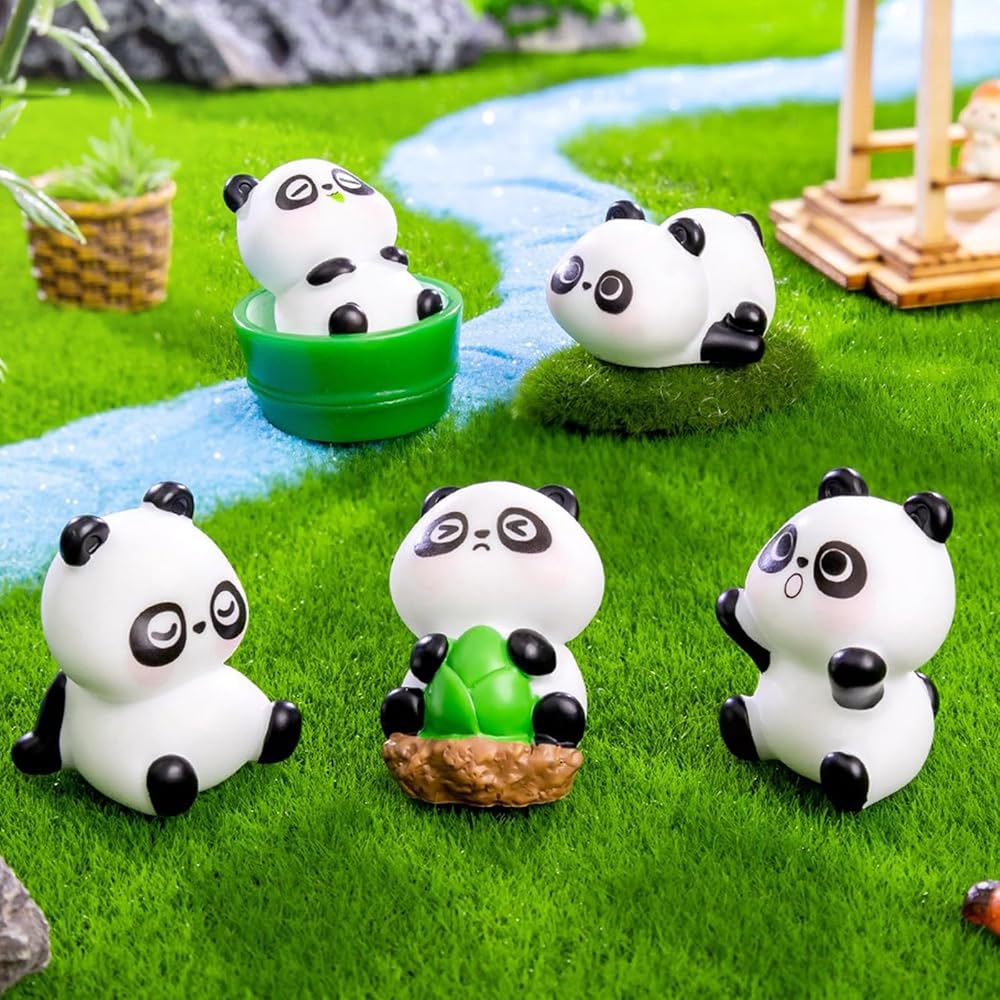 Charming Cartoon Pandas figurines : Spruce up your surroundings with these delightful miniature cartoon resin panda figurines, each boasting cute and vibrant designs that bring joy to any setting.