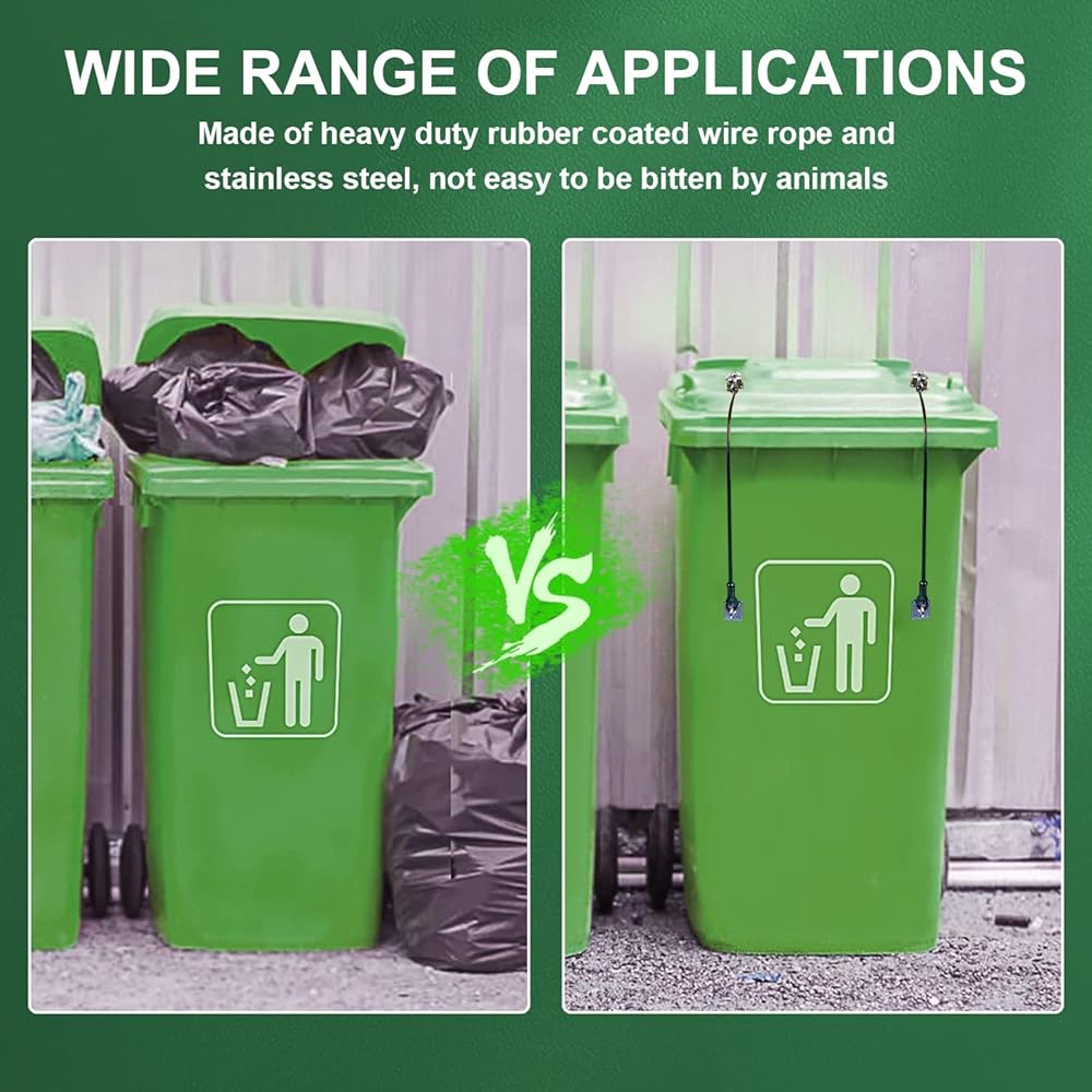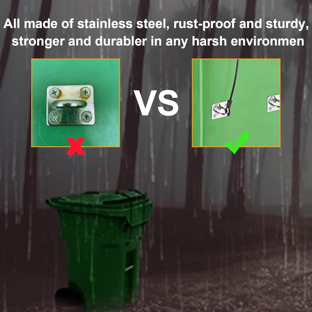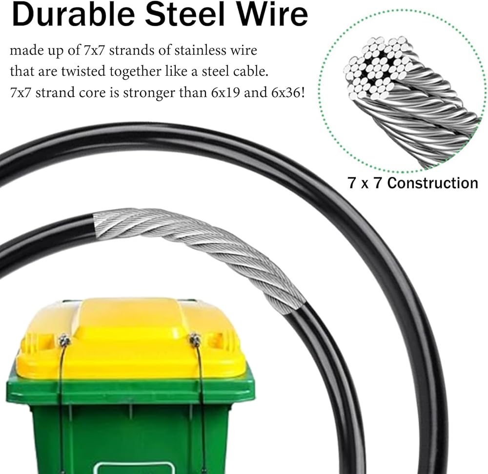 【Durable Construction】: Crafted from heavy-duty stainless steel wire coated with vinyl, our bear proof trash can lid locks are designed to withstand years of use. These locks are not easily chewed off by animals and can resist rough handling and harsh outdoor conditions, thanks to the stainless steel hasps, nylon-coated 7x7 wire rope, and rust-resistant hardware.