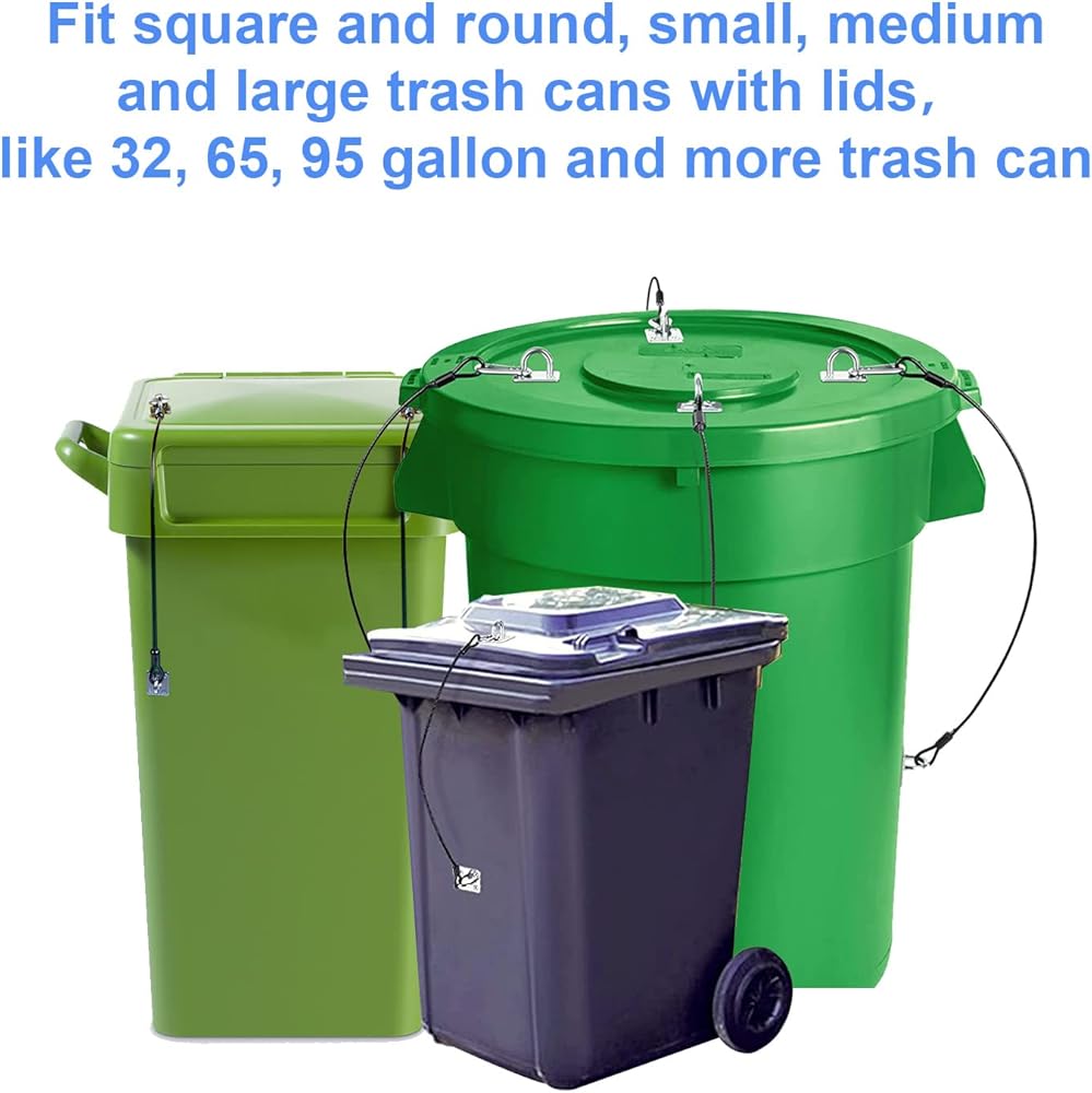 【Universal Size】: Our outdoor garbage can lid lock strap is 25 inches long and can be flexibly adjusted to fit various sizes and shapes of lidded trash cans. Whether you have a square or round, small, medium, or large trash can, our locks are suitable for 32, 65, 95-gallon, and even larger buckets.
