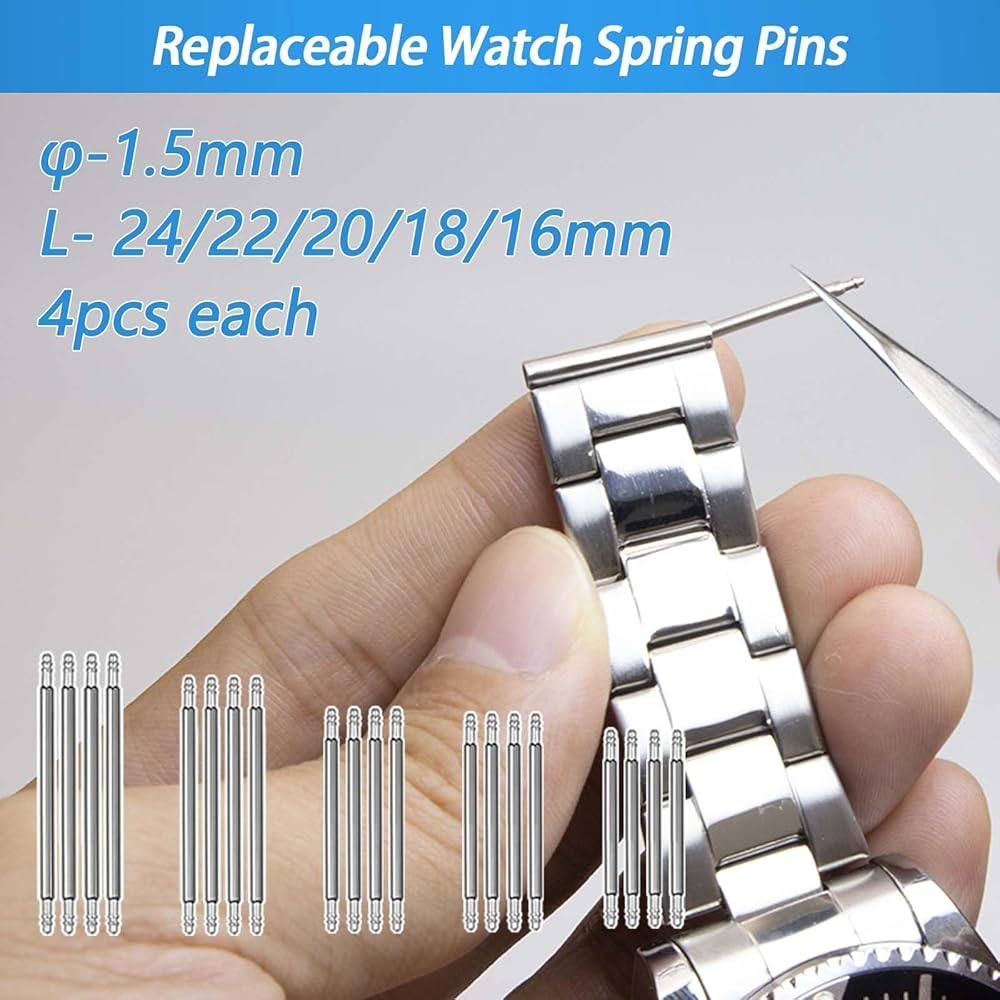 【PROFESSIONAL DESIGN】The watch strap replacement tool kit comes with A Spring Bar Tool and 20pcs Heavy Duty Stainless Steel Watch Band Pins, which are double shoulder design, allows you to quickly and easily insert and remove.