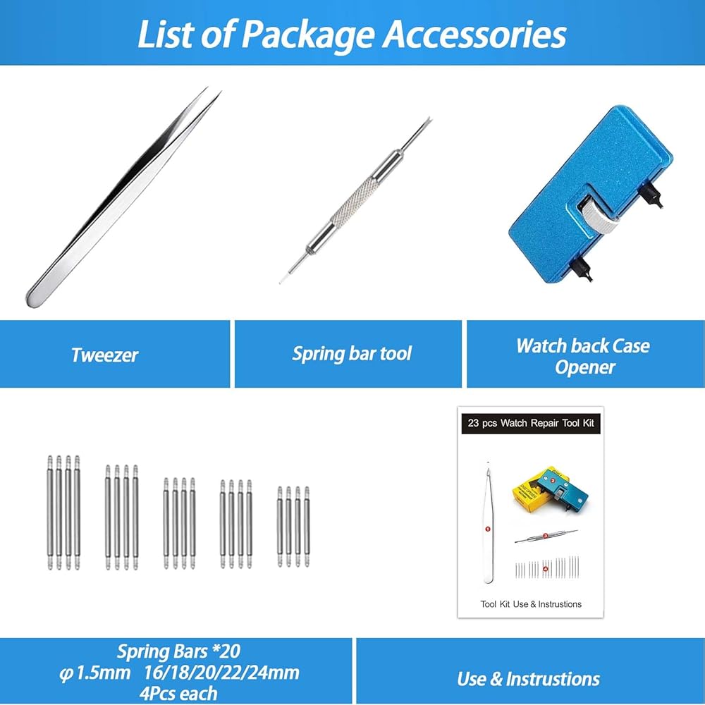 【MULTIFUNCTIONAL WATCH REPAIR TOOLS & KITS】GLDCAPA Watch Battery Replacement Kit contains 1pcs tweezers, 1pcs watch back case opener, 1pcs spring bar tool, 20pcs spring bars (size:16/18/20/22/24mm,4pcs each). Which solves lots of watch repair requirements like opening watch backs, watch band replacement, changing watch batteries, watch cleaning& maintenance, replacing a watch crystal, etc.