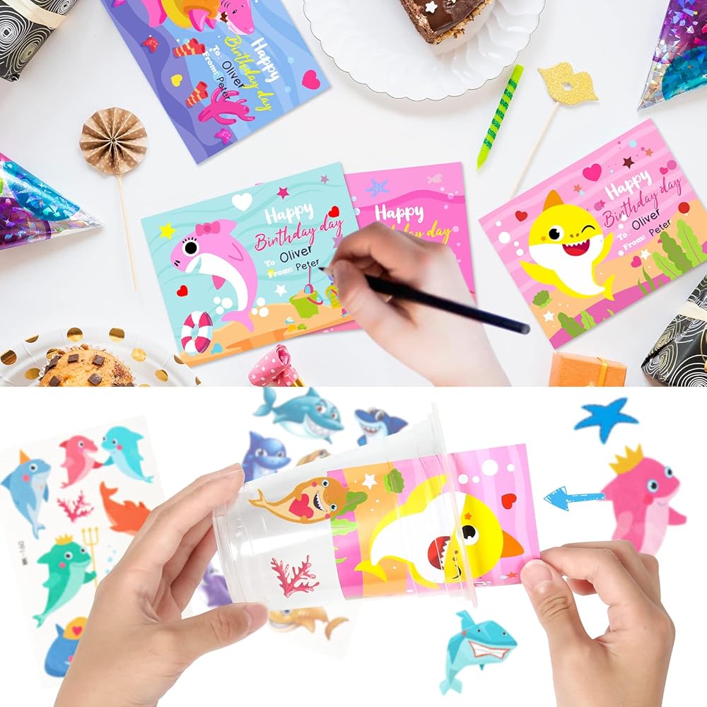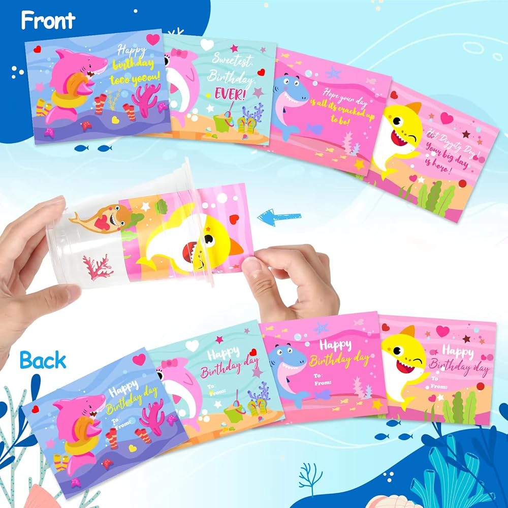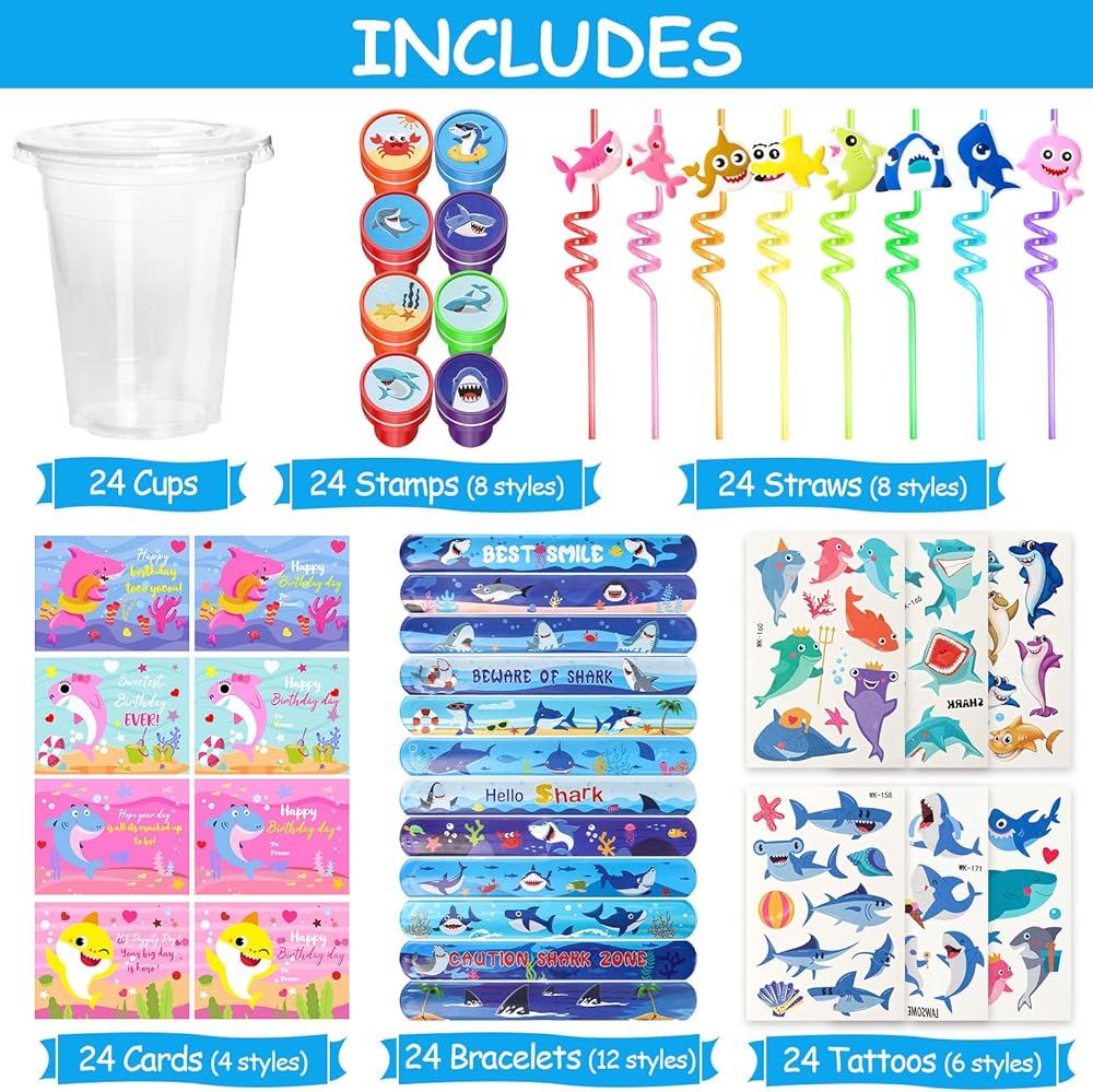 This party favors set contains the drinking straws, cups with caps, gift cards, slap bracelets, tattoos and stampers in the package, except the cups, all the items are with shark theme. But you can put the gift card into the cup.