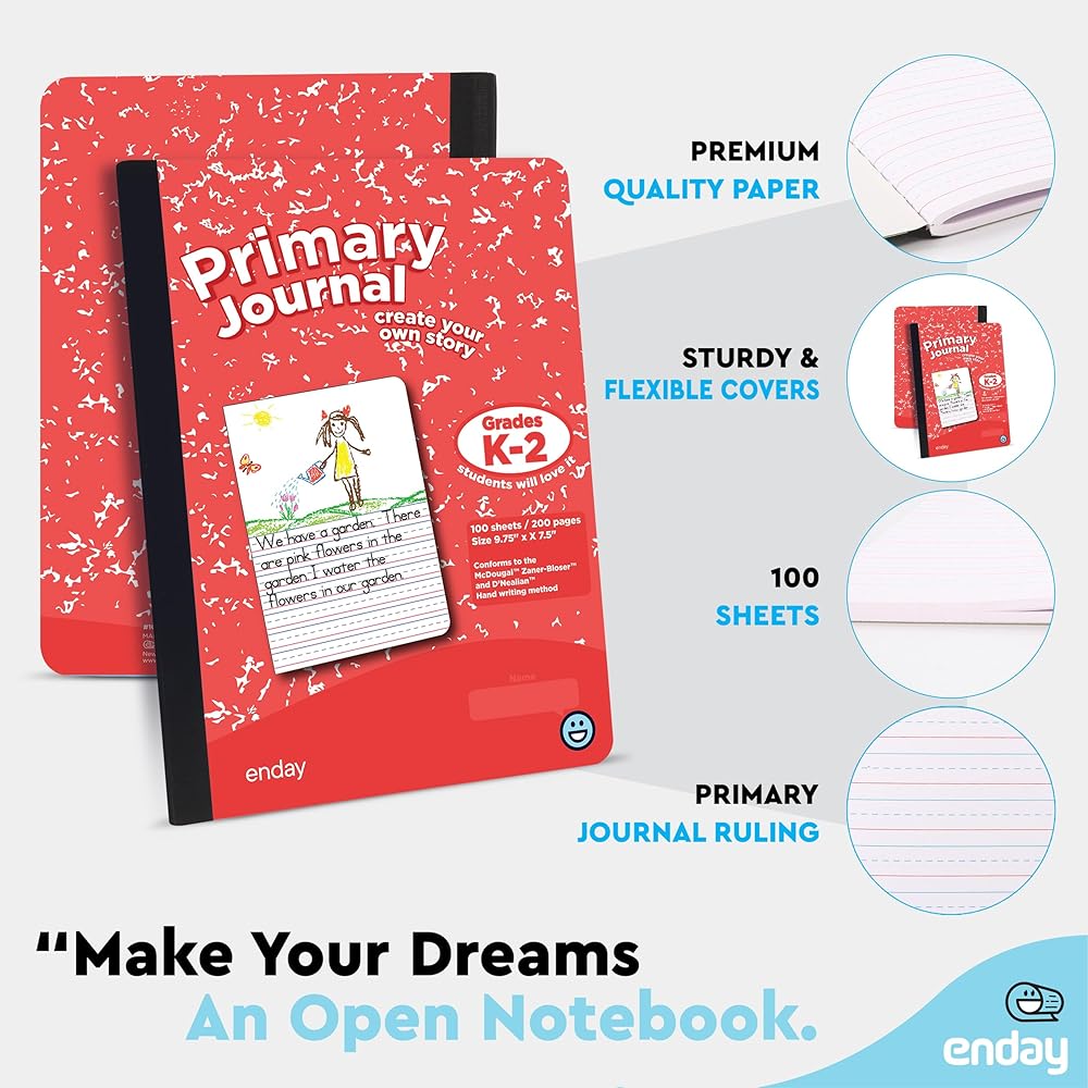 ✓ DESCRIPTION – The primary journal composition notebook contains 100 sheets. Pages are double-sided for plenty of notetaking space. The overall size of the primary composition book is 9.75" x 7.5". The primary composition journal has smooth white writing paper with a top blue line, red base line for letter positioning, and dotted black middle line for lowercase lettering. The paper handles mechanical pencils, gel pens, ink pens, and highlighters.