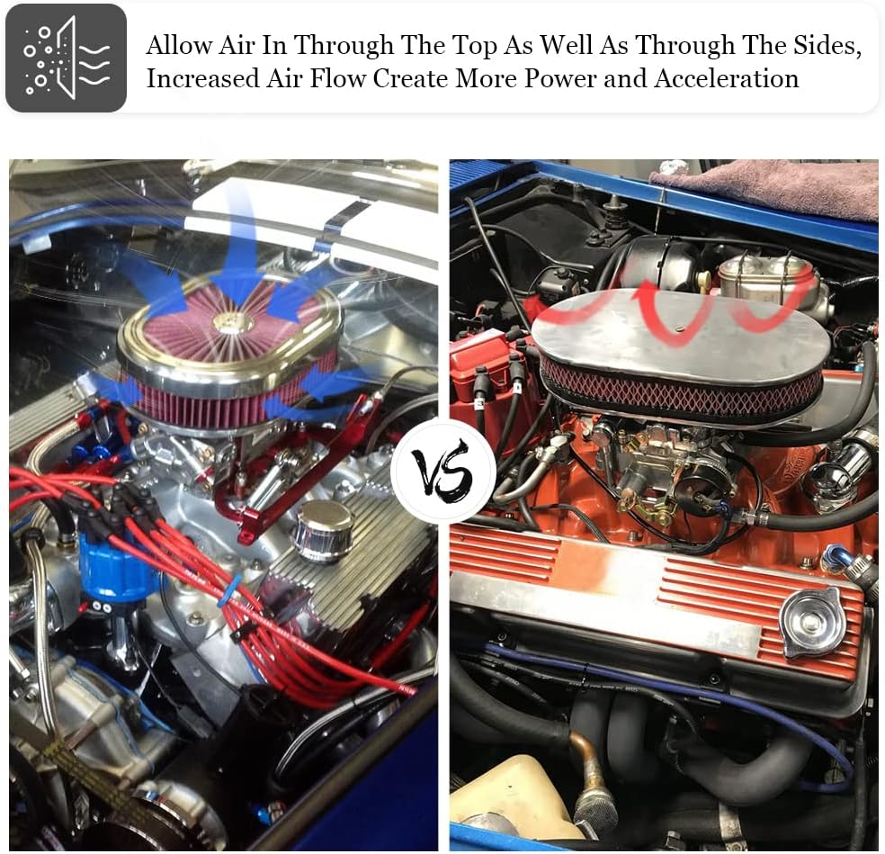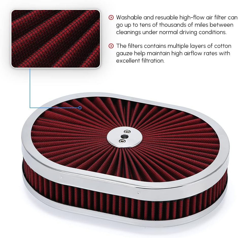 PTNHZ 12"x2" Oval Air Cleaner Filter Assembly 5-1/8" Carb Neck w/Flow-Thru Lid High Flow Chrome Compatible For GMC Chevy Ford Chryler Dodge