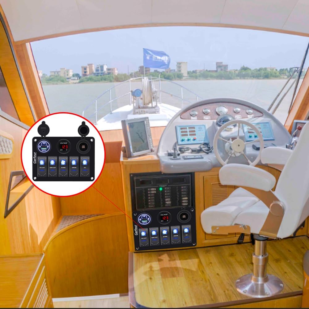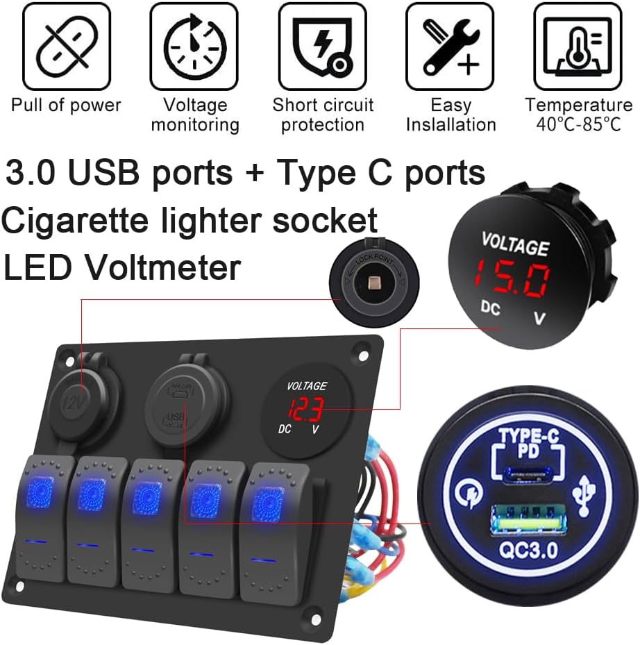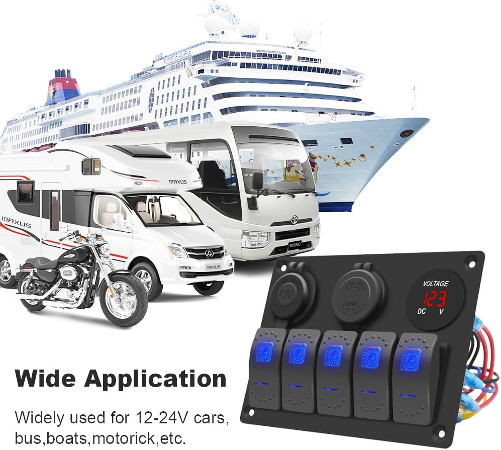 【Boat Switch Panel】: Consists Of 5 Blue Light Boat Switches, 5 Pin Switch Prewired For Easy Installation. Panel Is Made Of ABS/PC Material, Anti-scratch, Anti-corrosion, Waterproof Class IP55.