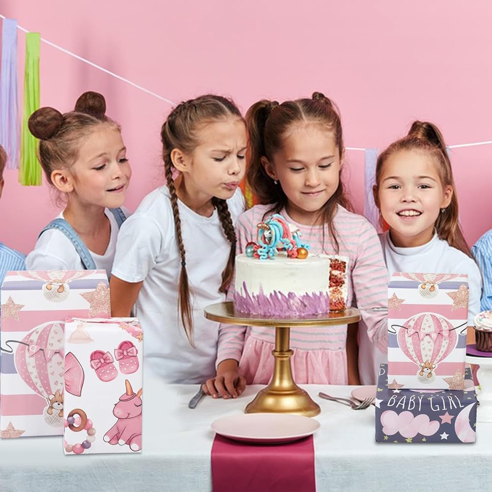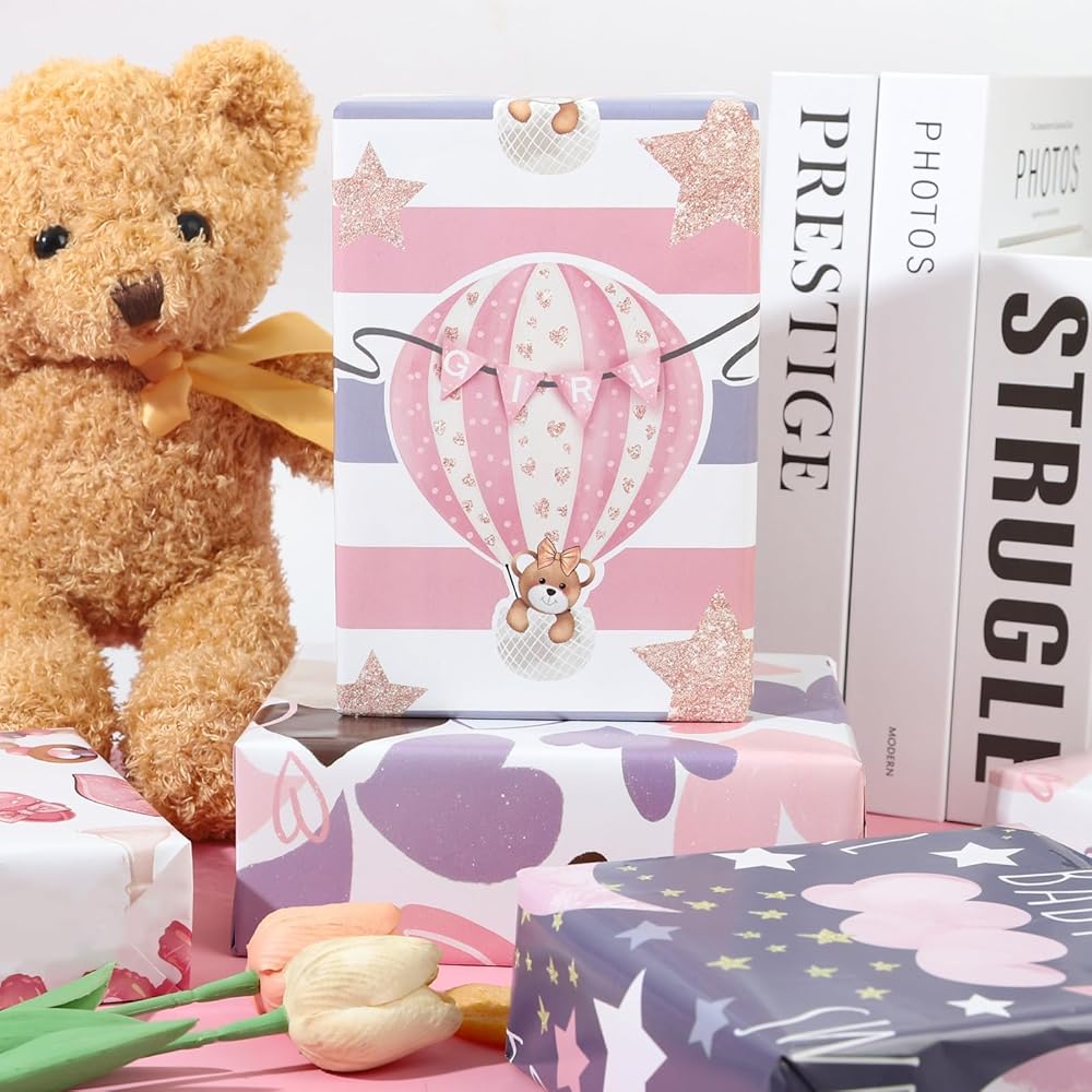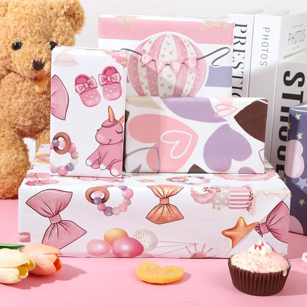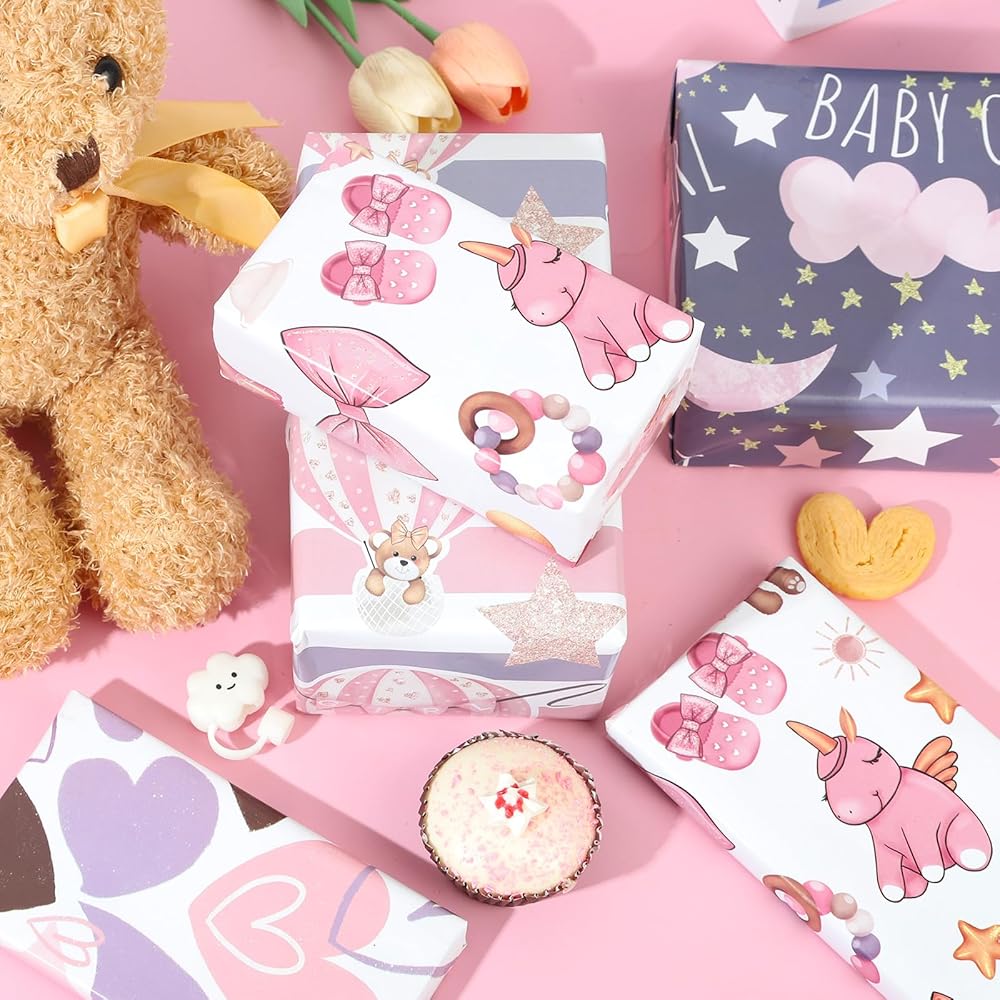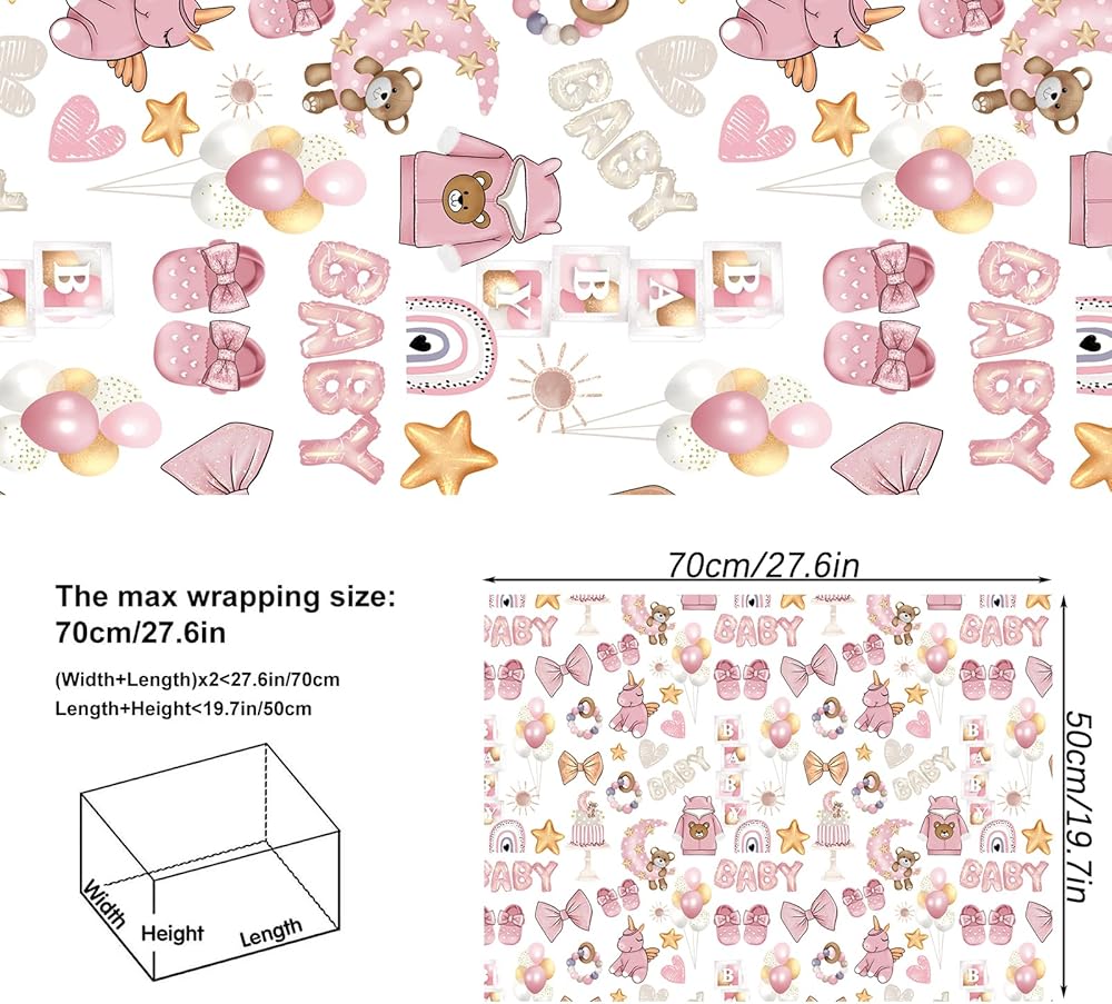 BABY GIRL DESIGN: Our wrapping paper contains balloon stars, moon clouds, baby, hearts 4 cute Pink cartoon patterns,great baby girl wrapping paper for kids, girls, and friends to make your gifts look beautiful.