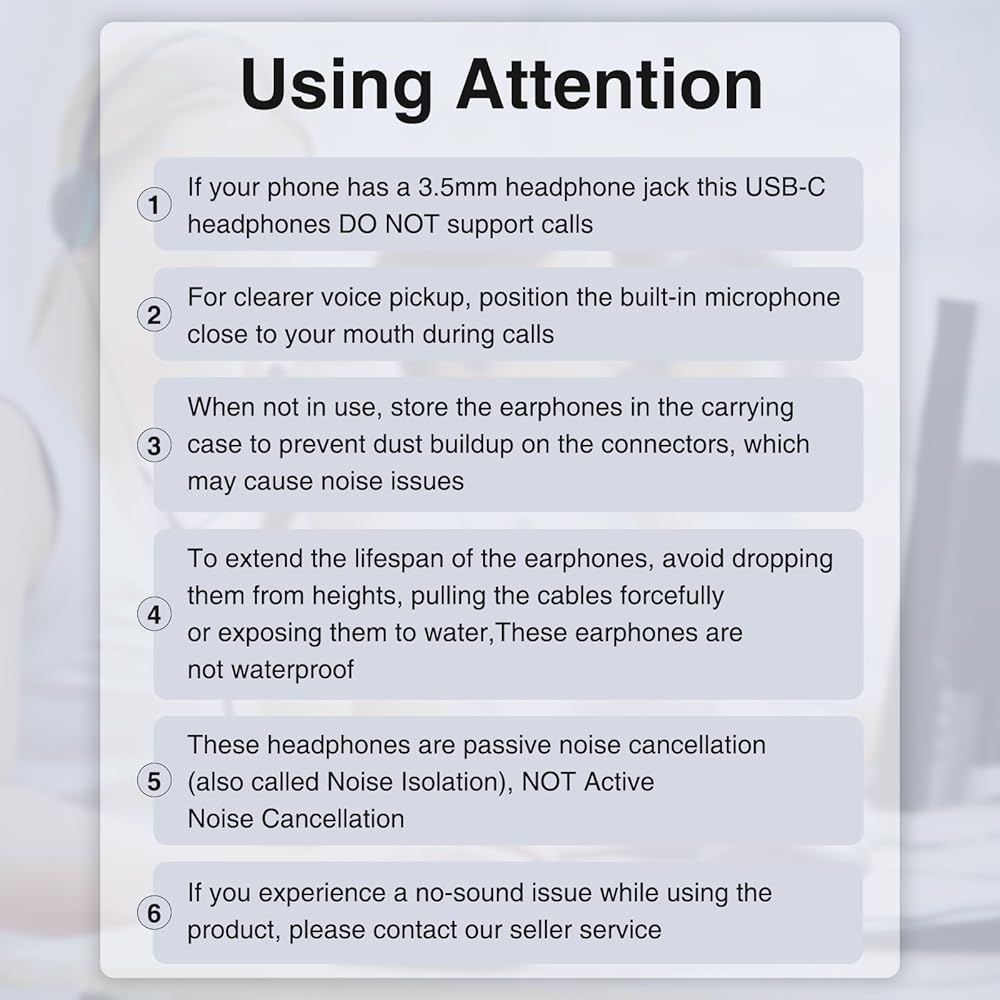 【Satisfaction Guaranteed】type c headphones wired with microphone x1, Headphone carrying case x1, Headphone cable clip x1, 2 pairs of spare earphones (S/L code is in the box, M code is on the headphones, cater to different needs.). If you have any questions after receiving the headset, please feel free to contact us. We will actively deal with it and provide you with a satisfactory solution.