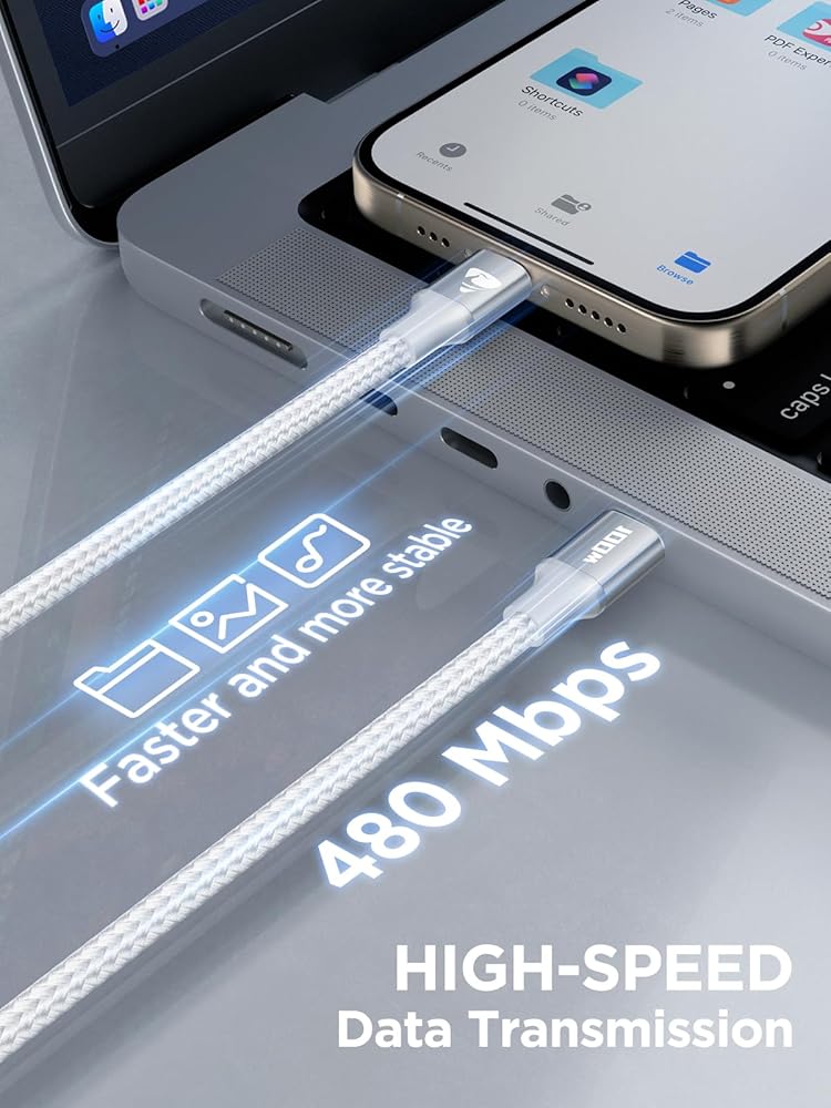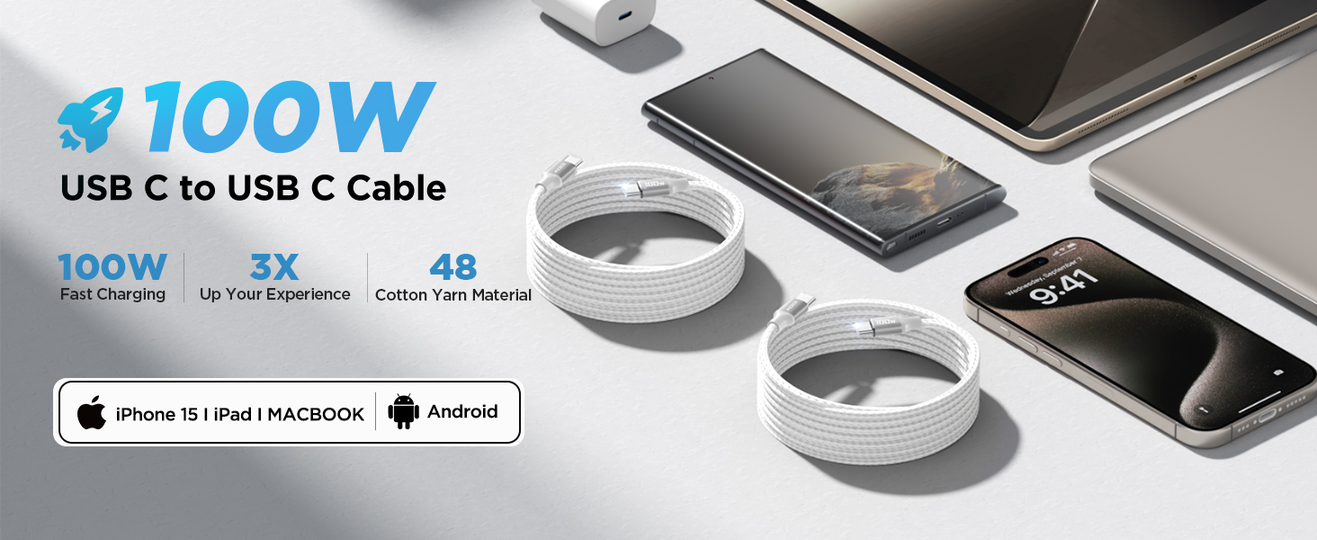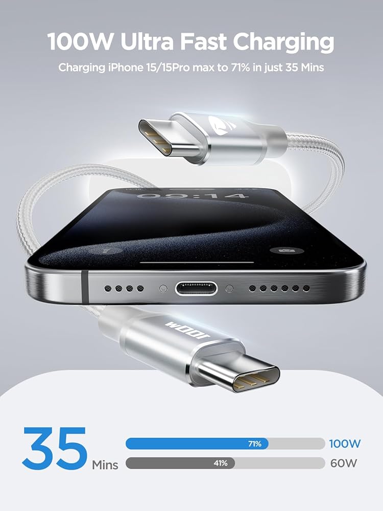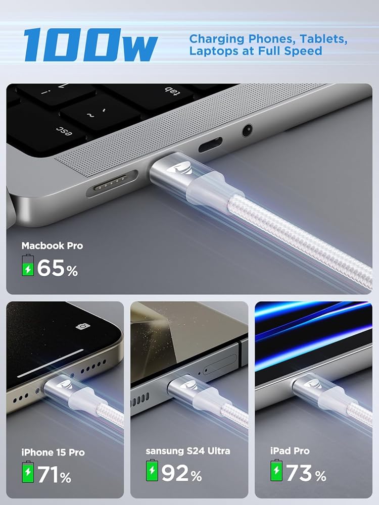 【100W/5A USB C Fast Charging】With our 2024 Upgrade PD 100W USB C to C cable charges your iPhone 15 to 71% in 30 minutes. supports up to 100W (20V/5A) output with usb-c power delivery adapters such as 20W/25W/30W/45W/60W/65W/96W/100W. Fast charge for MacBook Pro 14” up to 68% in 35mins, charge Samsung S23/s24 up to 92% in 35mins. (NOTE: The actual charging speed depends on your device and wall charger.)