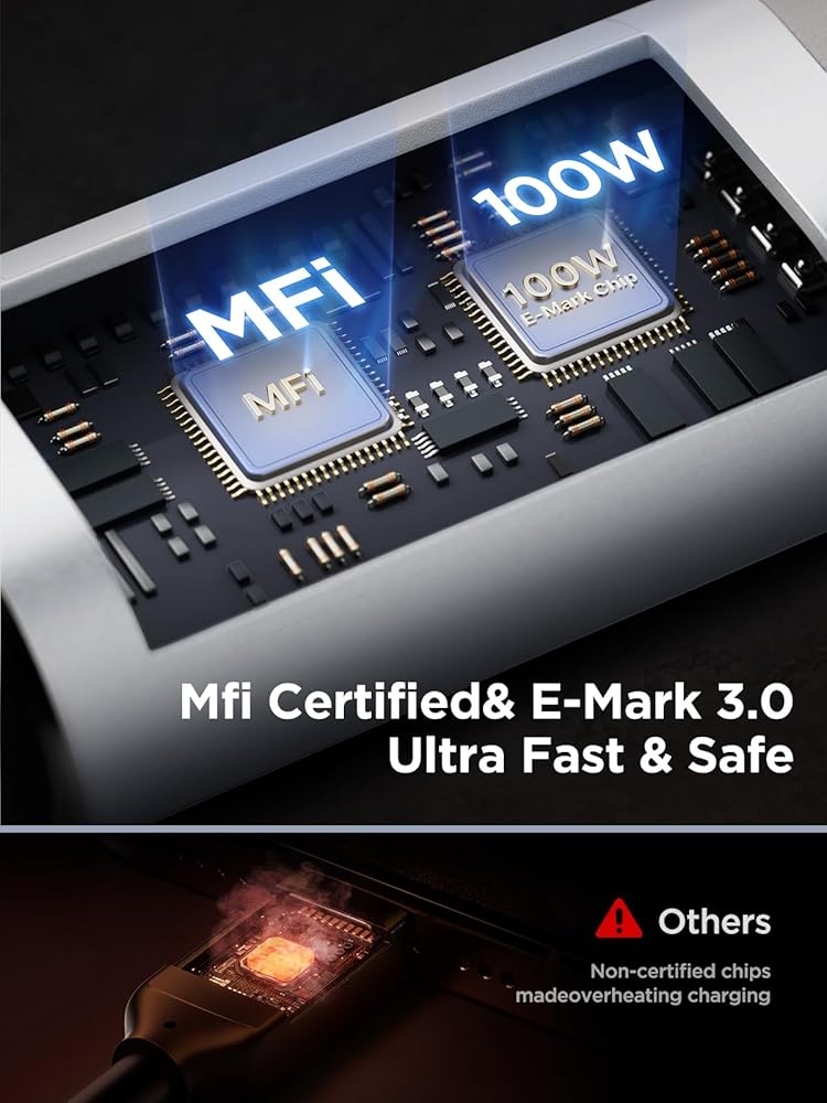 【MFI Certified & Emark Chip】Multiple built in safeguards with these USB C to C Charger cable. Our usbc to usbc cable has passed MFi Certified to ensure 100% compatibility with iPhone iPhone 15, 15 Pro, 15 Plus, 15 Pro Max. and Aioneus 100W super fast charging USB C cable is build in the best power delivery E-Mark chip, which supports USB PD fast charging and provides comprehensive protection to devices battery and adapters, keep you in light-speed charging and safe.