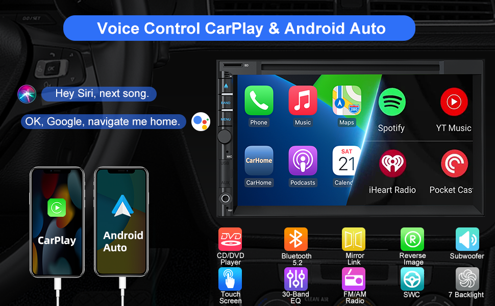 • 【Voice Control CarPlay & Android Auto】 The double din car stereo receiver support CarPlay & Android Auto. You can make calls hands-free with the help of Siri/Goo-gle Assistant, easy to get phone contacts, emails, notifications, map navigation, music and more which let you focus more on road safety while driving! (Note: Not applicable to models with Sirus, Bose, OnStar systems)