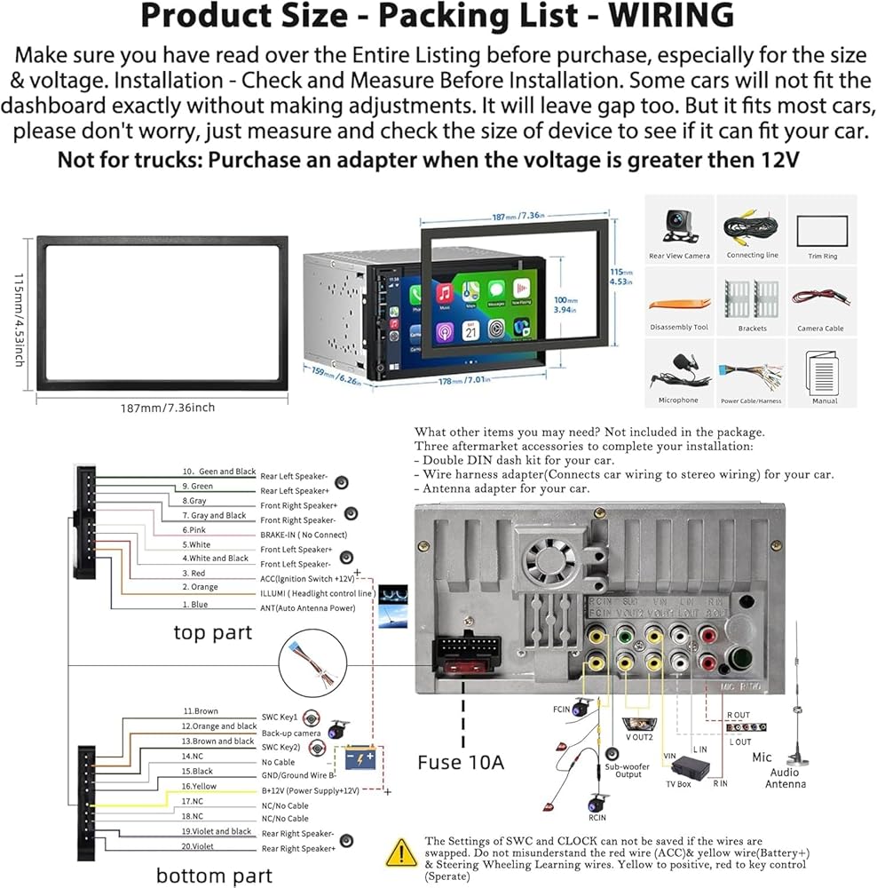 • Important Tips: ①Please read the instructions before installation and it is recommended to install at a professional car audio shop. ②Please confirm that your dash size, factory wiring harness and radio antenna adapter are suitable before ordering, if not, you need to purchase after-assembly accessories suitable for the car model. ③the unit is not android system.