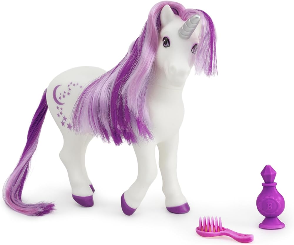 Clean her with warm water, and watch her mane, tail and celestial markings change color! When she dries, colors return to normal. Includes: Luna unicorn, bathrobe, atomizer spray bottle, and brush. Luna will make bath time magical!