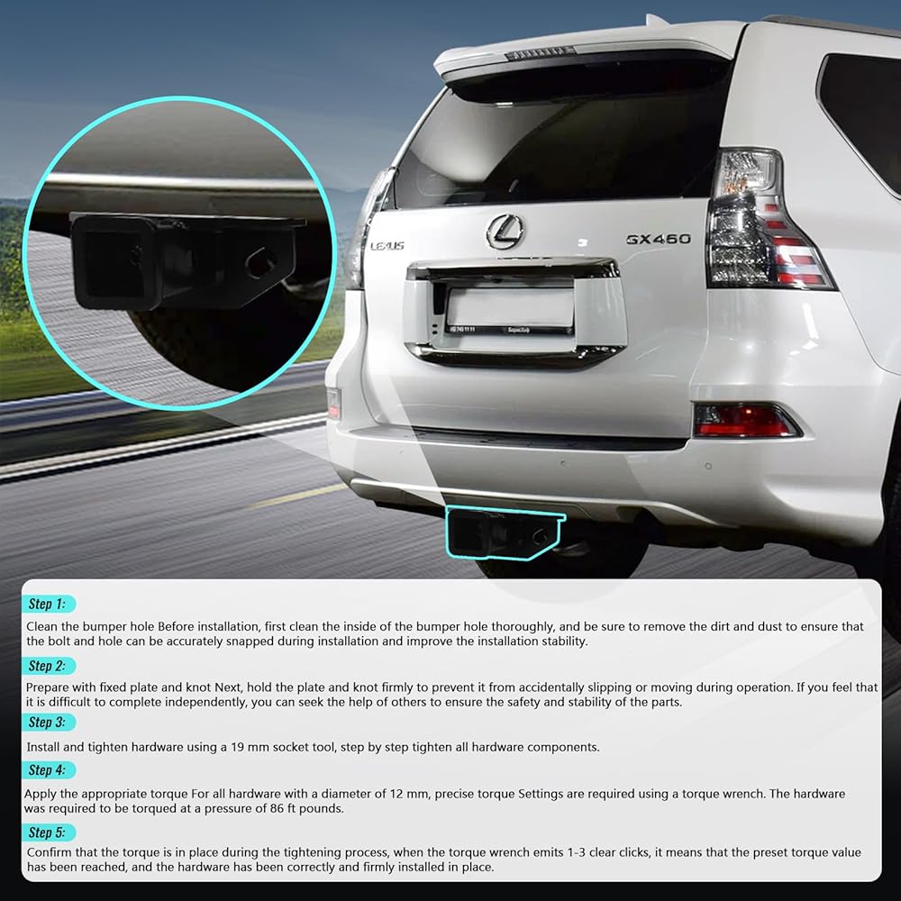 【Rigorous Testing and Standards Comp liance】The Class 3 trailer hitch receiver has passed rigorous real-world environmental testing and is designed to integrate seamlessly with the Lexus GX460 model. In addition, it follows the SAE J684 standard for specialized safety performance tests to ensure safety and reliability during the towing process.