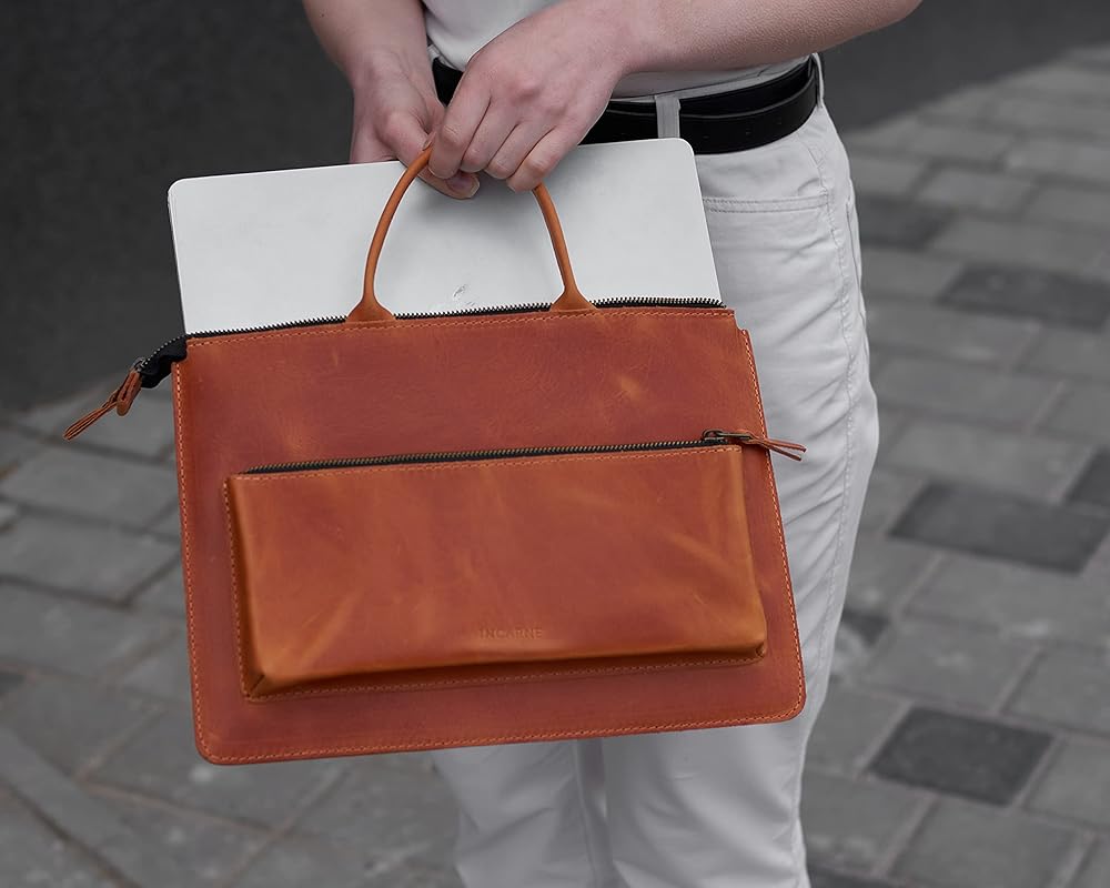 👍 INCARNE's Signature Quality and Style: Elevate your MacBook Air & Pro 13" with INCARNE's Leather Computer Bag in cognac, a testament to our commitment to high-quality materials, thoughtful design, and the perfect blend of functionality and aesthetics.