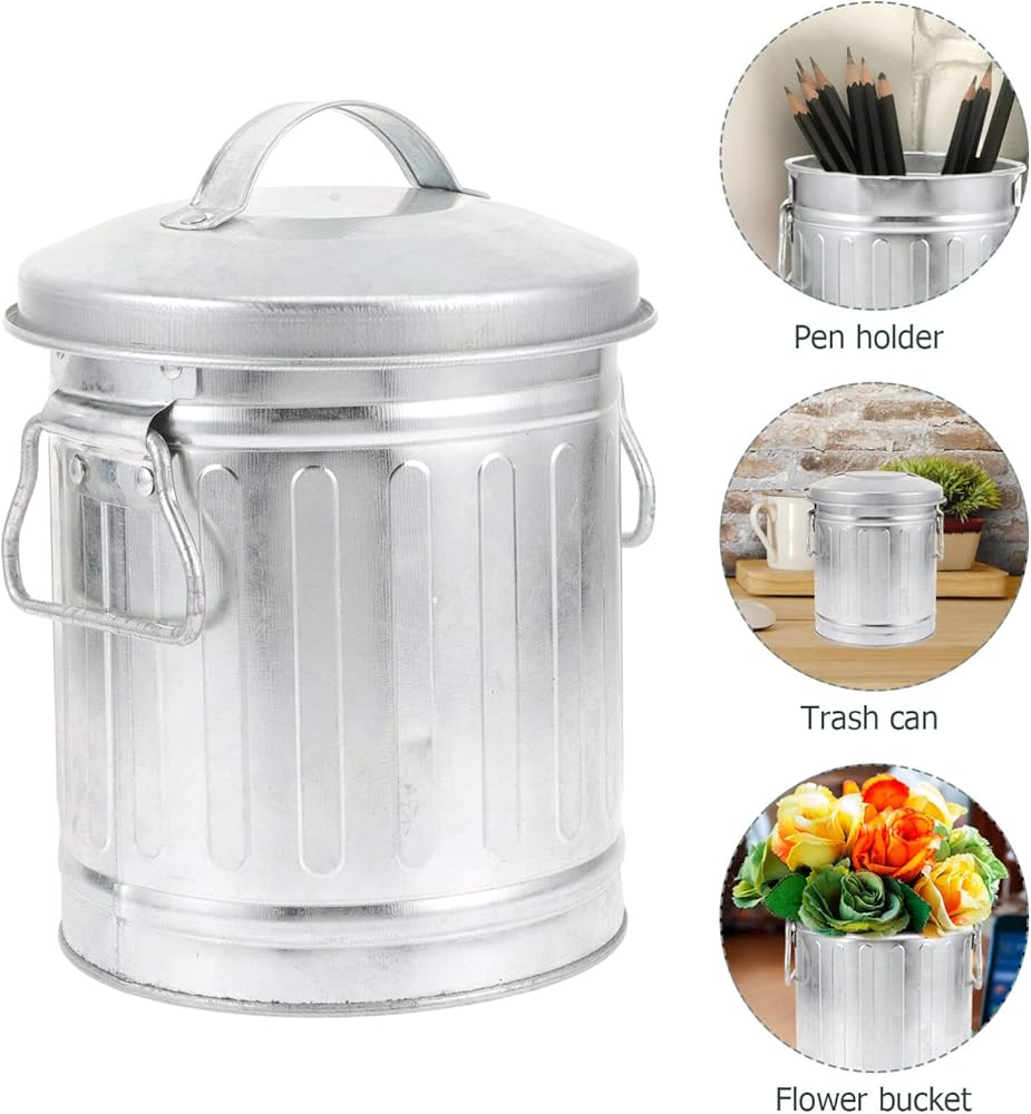 🗑️🗑️🗑️ Metal bucket with lid is versatile and can be used as desktop storage bucket, pen holder, makeup brush holder. Great for desktop, table top, countertops for home, office, dorm, etc.