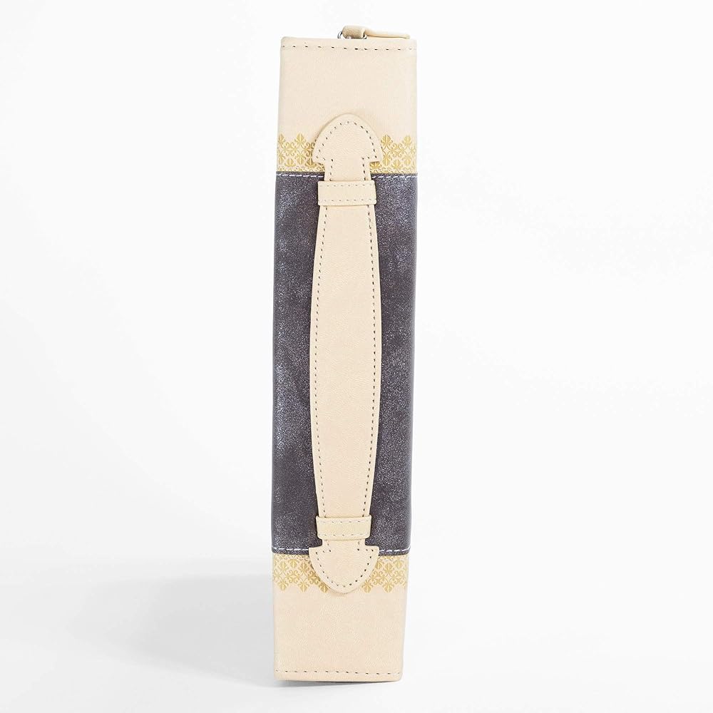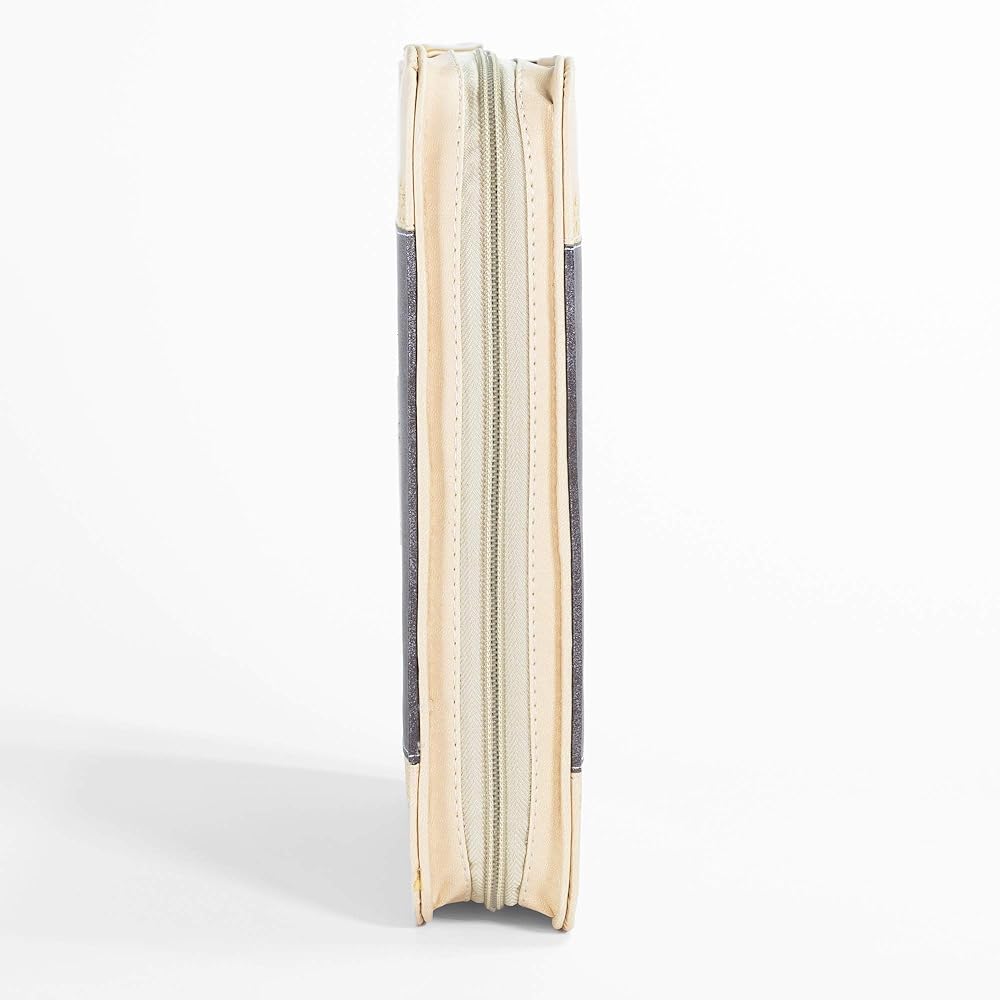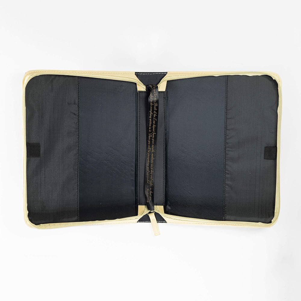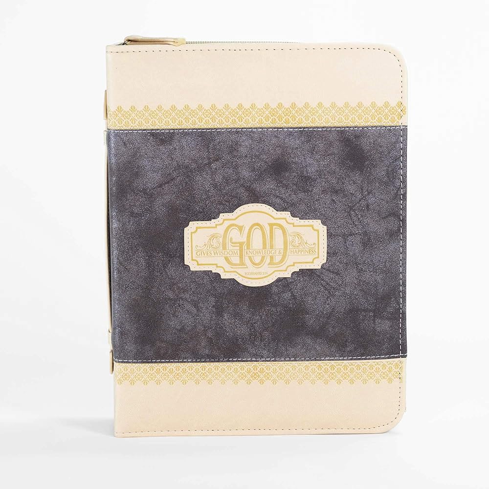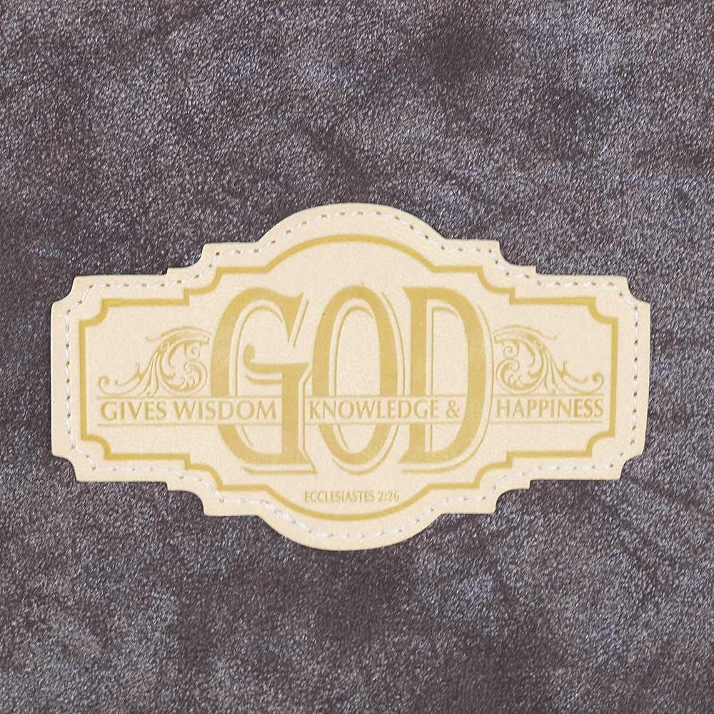 This Deluxe Faux leather Bible cover showcases exclusive hot stamp in intricate detail with scripture verse "God gives wisdom, knowledge and happiness." -Ecclesiastes 2: 26. Sewn in zippered closure and spine carrying handle for easy handling.