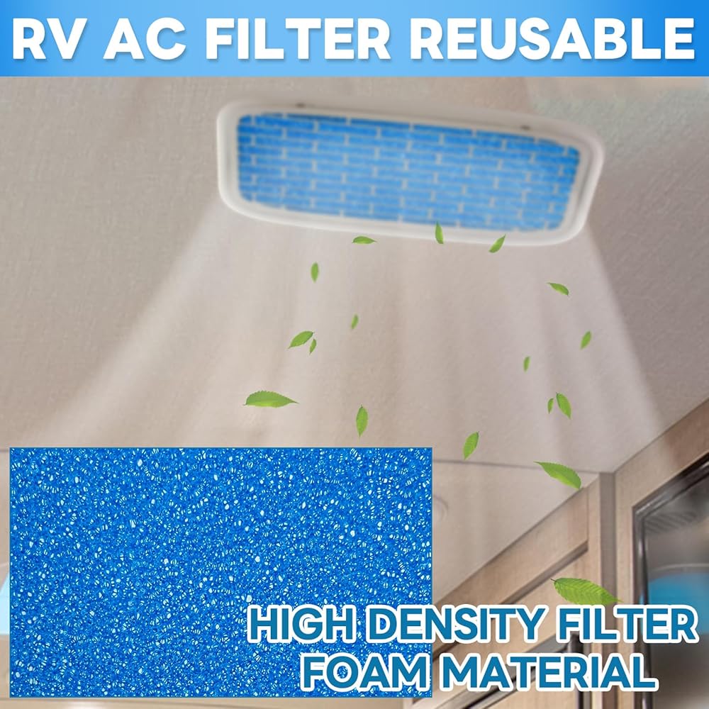 [Washable and Reusable]: This filter is made of advanced high density filter foam material. It has a compact structure and is not easy to block. It can be washed clean with water and reused for many times, saving a large bill for your travel and RV. It can captures debris, dust particles and hair in the air efficiently, doesn't get stuck in your AC. This also helps to extend the life of your unit