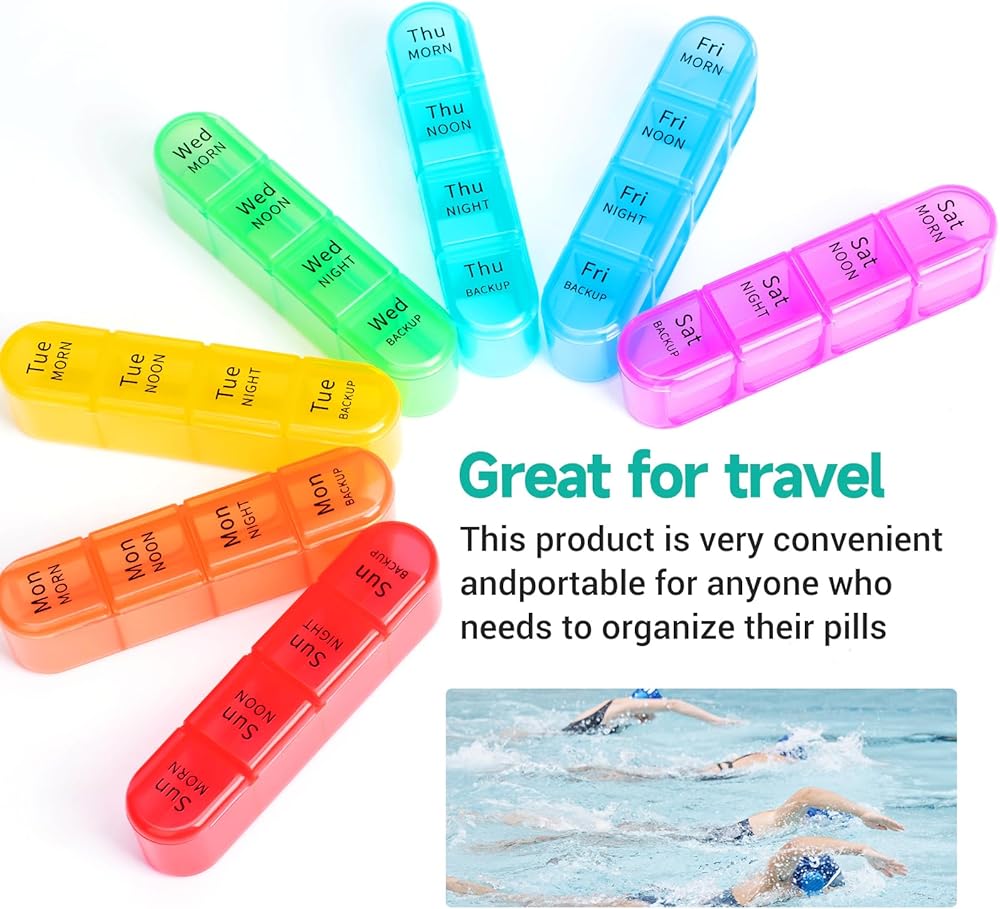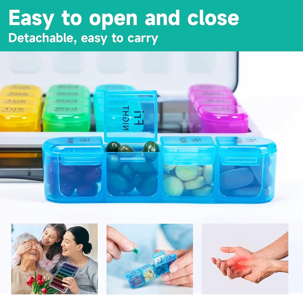 One Day One Individual Box: This weekly 7 day pill container is perfect for taking pills 4 times per day. The individual compartments are plenty large and the overall container keeps out the dust or liquids. Each day can be removed individually for easy access for that day and perfect for travel.