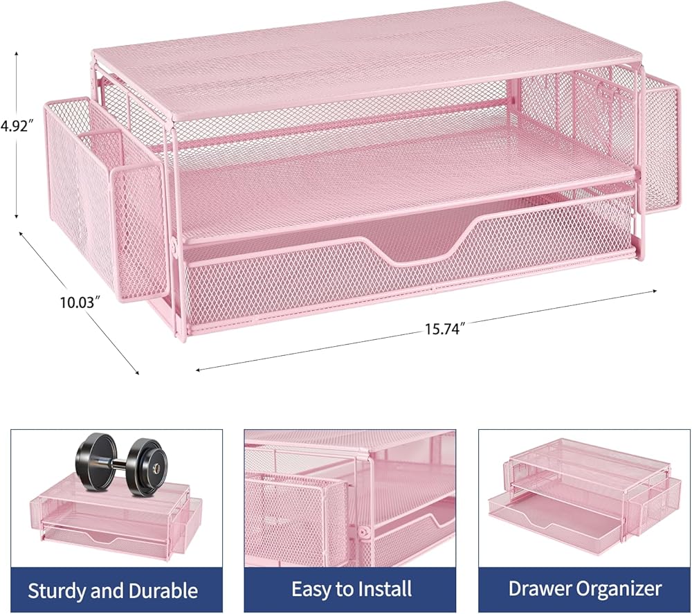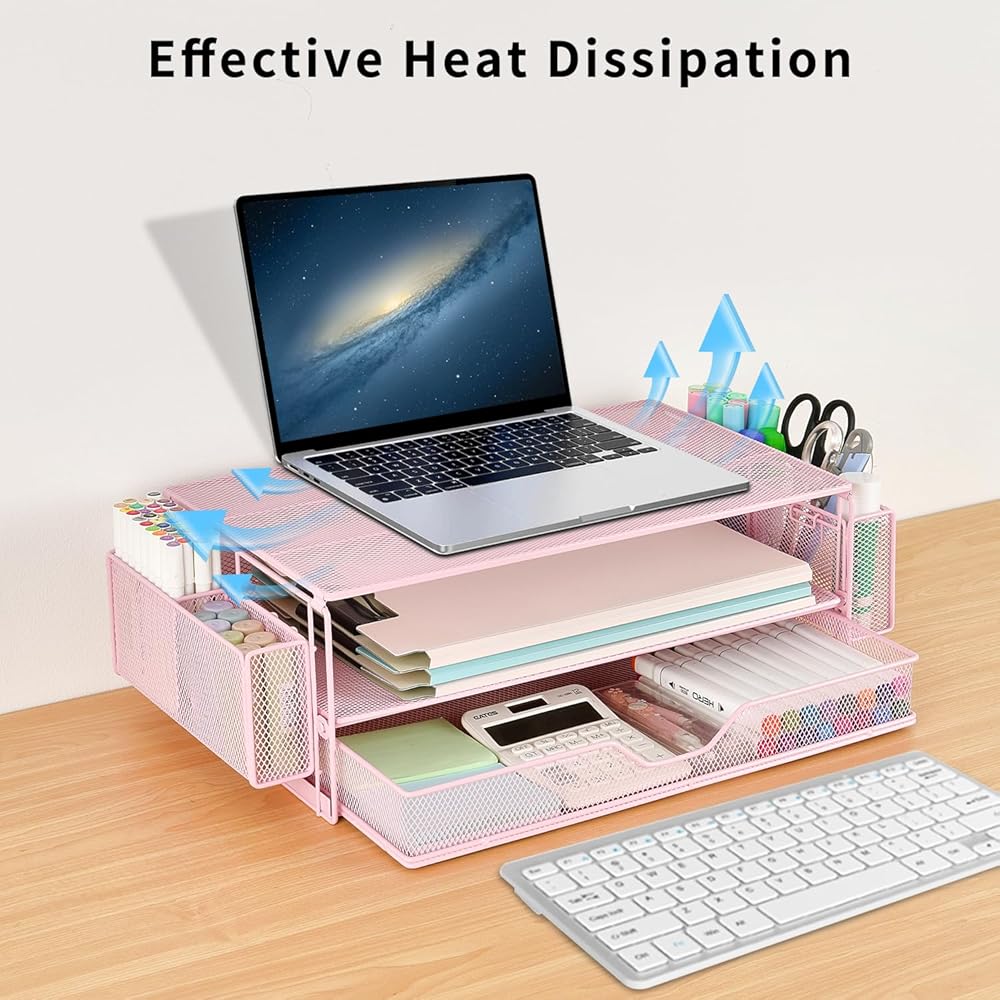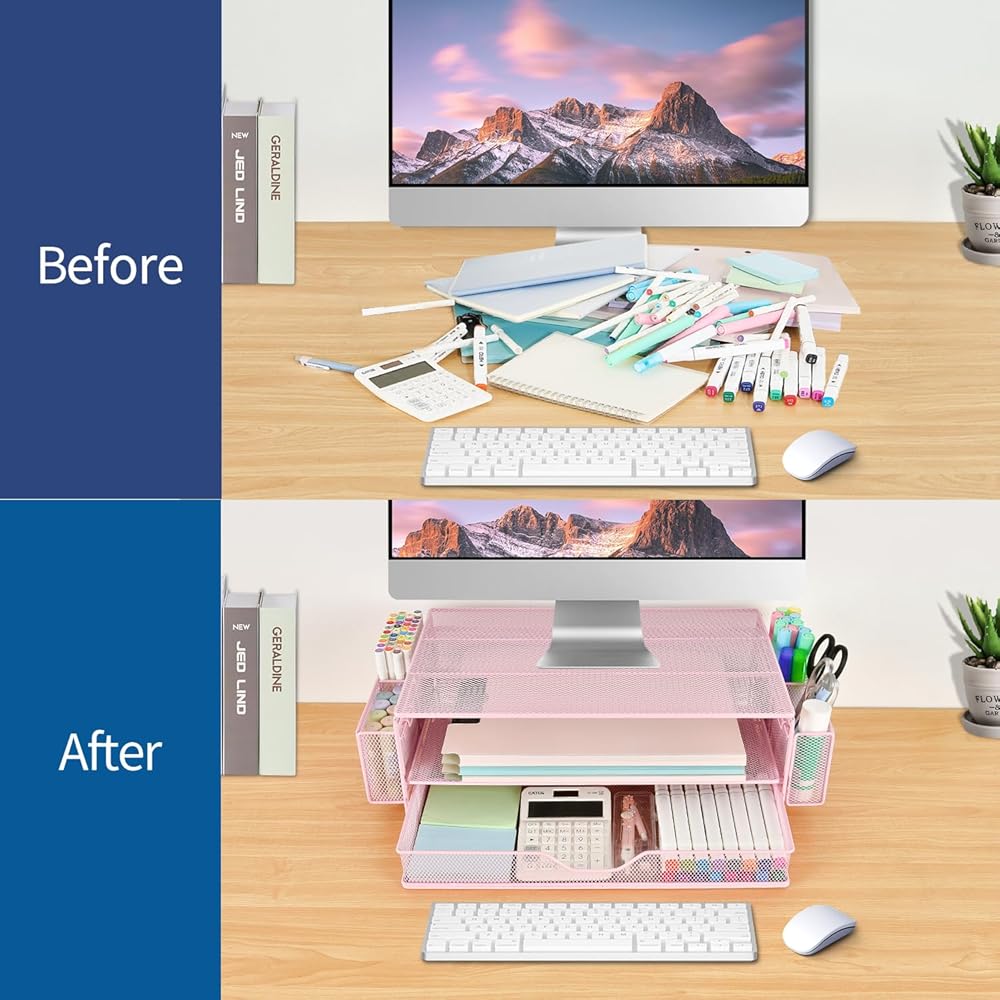 [تخزين متعدد الوظائف] يمكن لحامل شاشة الكمبيوتر أيضًا أن يكون بمثابة رف تخزين متعدد الوظائف، مع أدراج مدمجة لتخزين اللوازم المكتبية والملحقات، مما يوفر مساحة تخزين واسعة لمستلزمات مكتبك وملحقاته، مما يجعل بيئة العمل أكثر كفاءة ومرتبة.