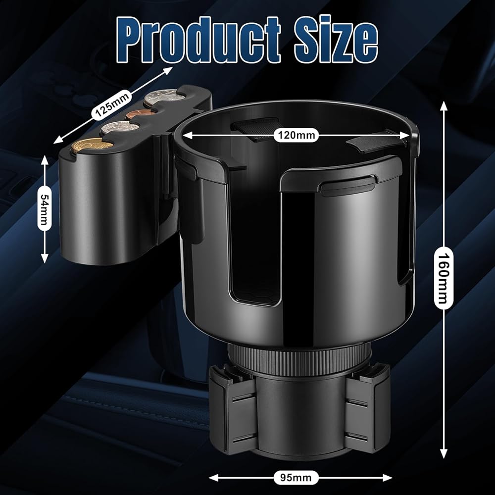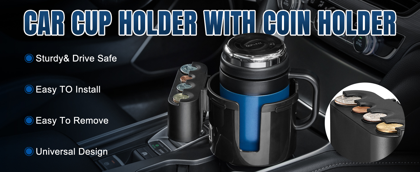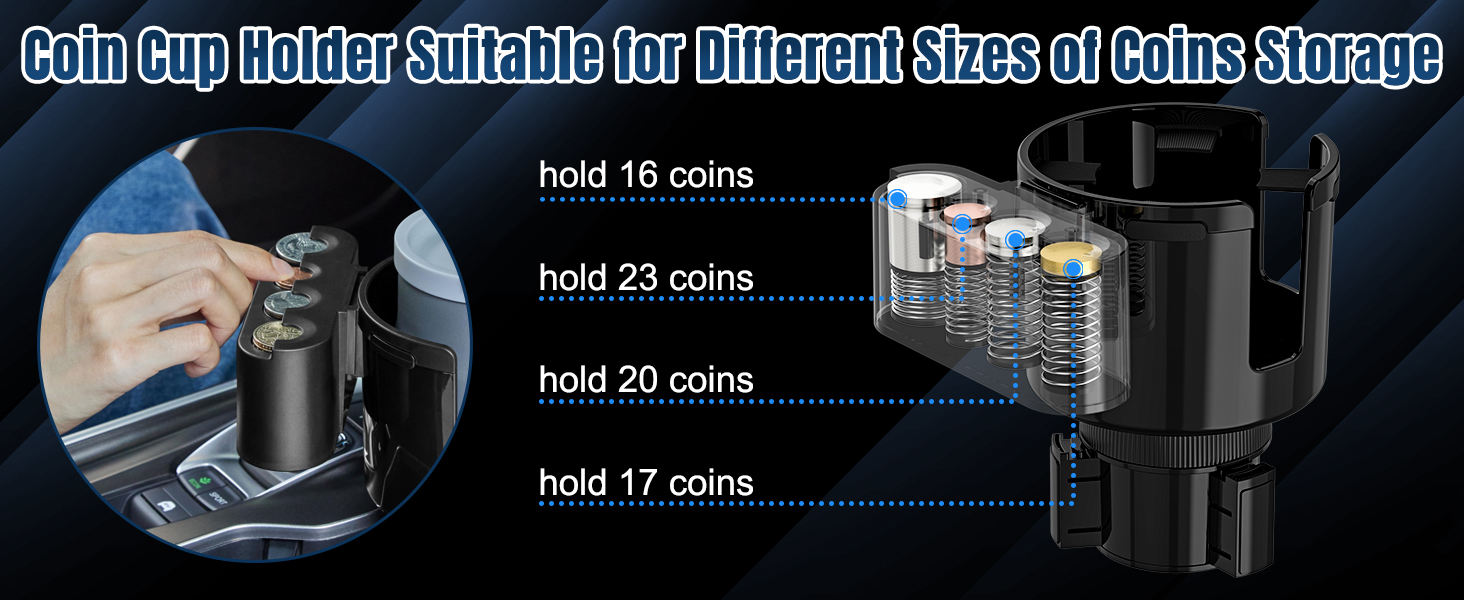 【2 in 1 Upgraded Coin Holder for Car】The latest car cup holder expander has a coin holder and cup holder two-in-one function. Different specifications: There are four vacancies in the coin box.Our coin holder can hold up to 16*50 Cents, 23*1 Cents, 20*10 Cents, 17*1 US Dollars, each position is designed for US coins.The car coins are compatible with coins of different sizes, with double U-shaped cups fit for most cars, trucks, RV,etc., keep your car always tidy and organized.