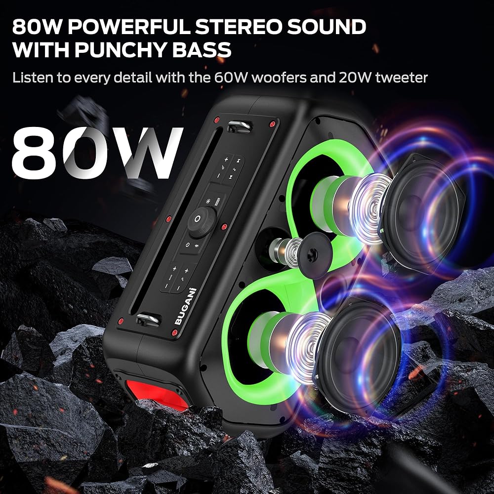 【80W Powerful Sound】 Immerse yourself in the cutting-edg audio with BUGANI Party Go Portable bluetooth speakers. The loud bluetooth speaker boasts a formidable 80W to blow you away, the dual 35W subwoofers orchestrated by a low-frequency regimen to resonate deep within your chest, and a 10W tweeter for remarkable high-frequency precision and restoring intricated sonic subtleties. The BUGANI Party Go speakers bluetooth wireless loud are suitable for all musical genres: pop/rock/country/R&B/metal.