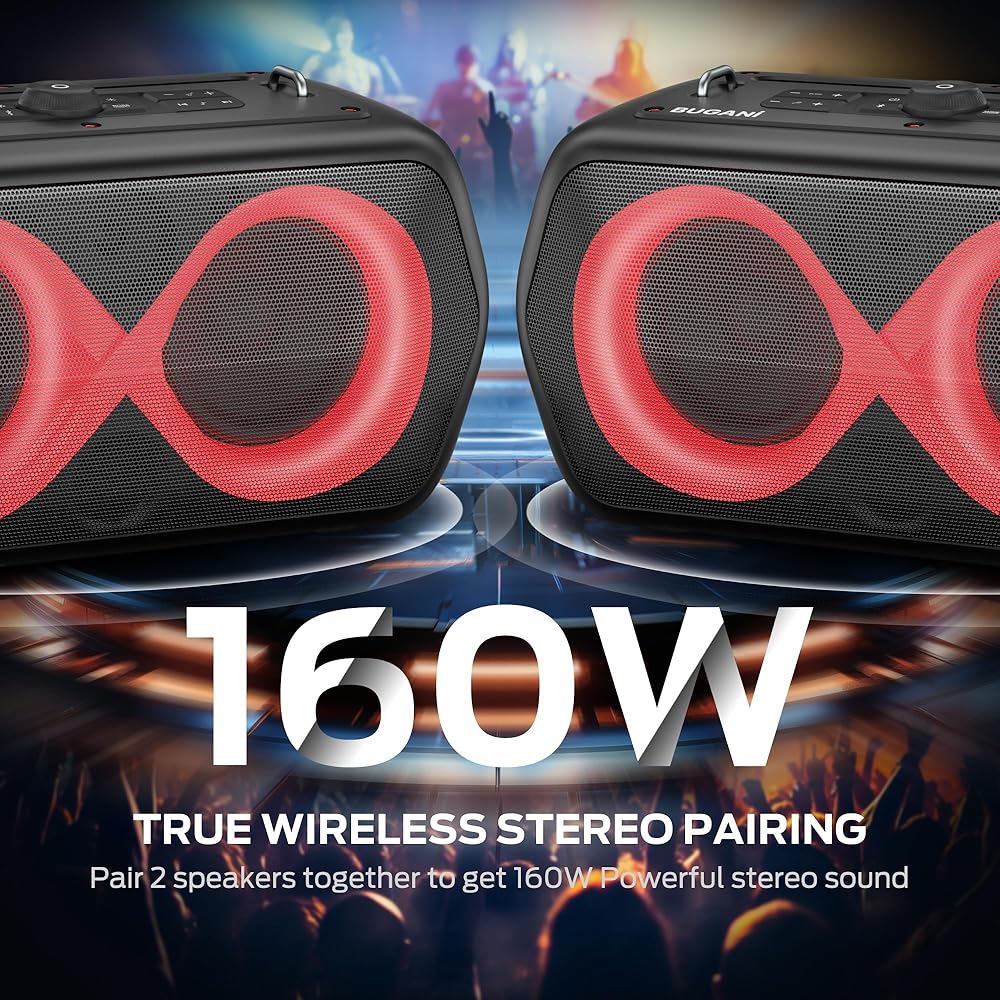 【160W Wireless Stereo Pairing】 Easy pairing of two BUGANI Party Go portable bluetooth speakers to create a prodigious 160W ultra-stereo resonance, where the left and right channels coalesce into a brilliant symphon, captivating your senses with an immersive embrace. It is a wonderful portable home theater bluetooth speaker to enjoy movies, games, and Christmas parties.