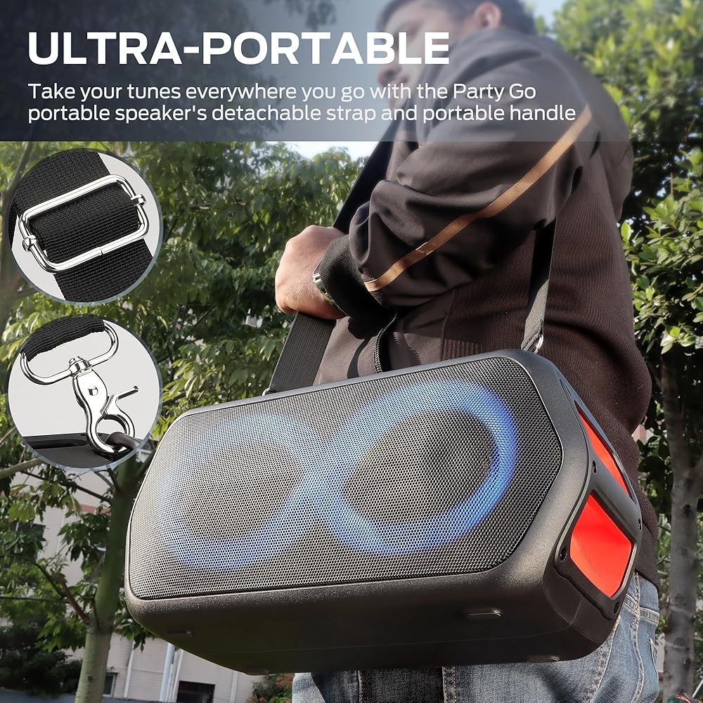 【Easy Connectivity & Versatility】The portable speakers bluetooth wireless have 3 types of connections to play music: wireless Bluetooth, AUX 3.5mm, and USB Disk, which connect easily to enjoy music anytime, anywhere. The outdoor Bluetooth 5.3 speaker can play for up to 20 hours at medium volume, while you're outdoors, you can use its built-in USB port for emergency charging for your cell phone or other USB devices. Take your tunes everywhere you go with the Party Go portable speaker's detachable strap and portable handle.