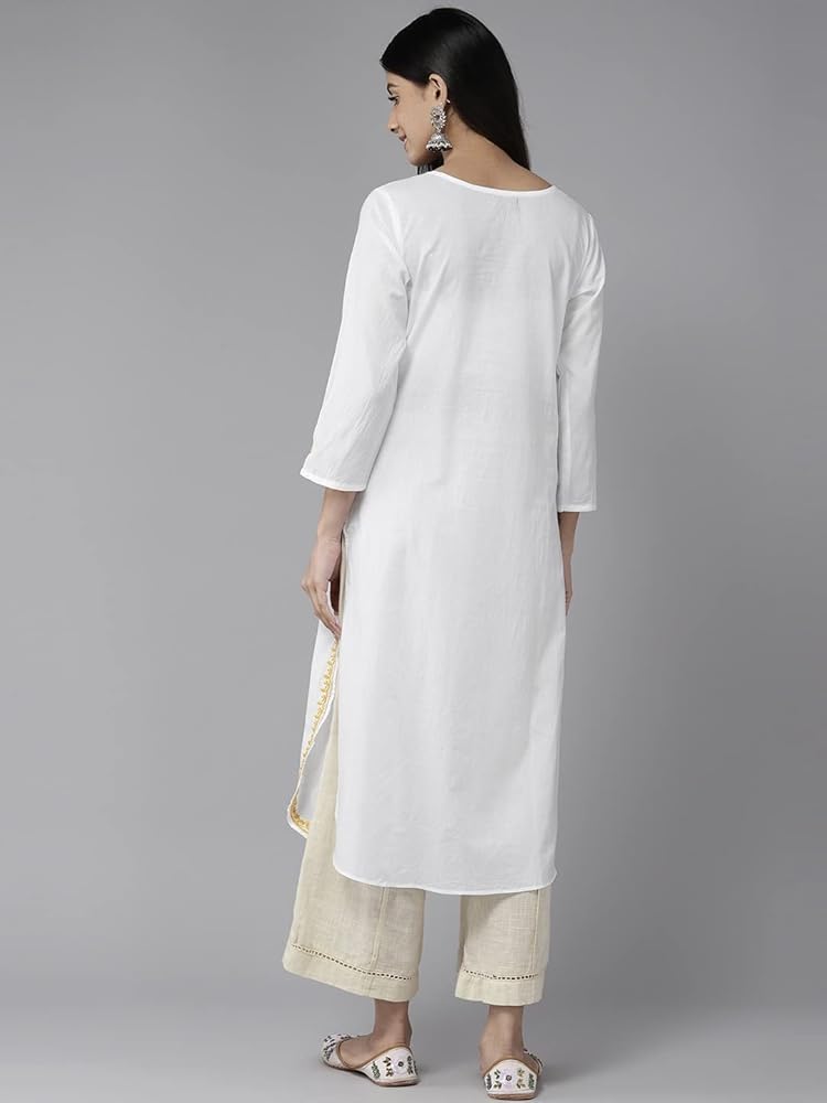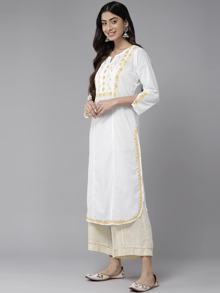 Kurta has a notched neck, 3/4th notched sleeves, round hemline, calf length with side slits