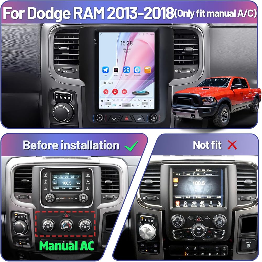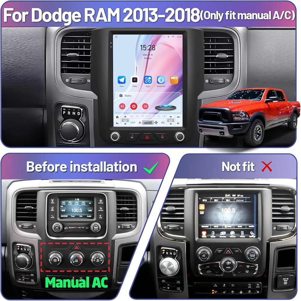 【Applicable car models】9.7IN car radio stereo compatible with Dodge Ram 1500 2500 3500 2013 2014 2015 2016 2017 2018, Note: this car radio only fit carswith manual A/C and not compatible with auto A/C. equiped with T-style HD IPS 768*1024 resolution screen to provide clearer and sharper image for watching movie and operation.