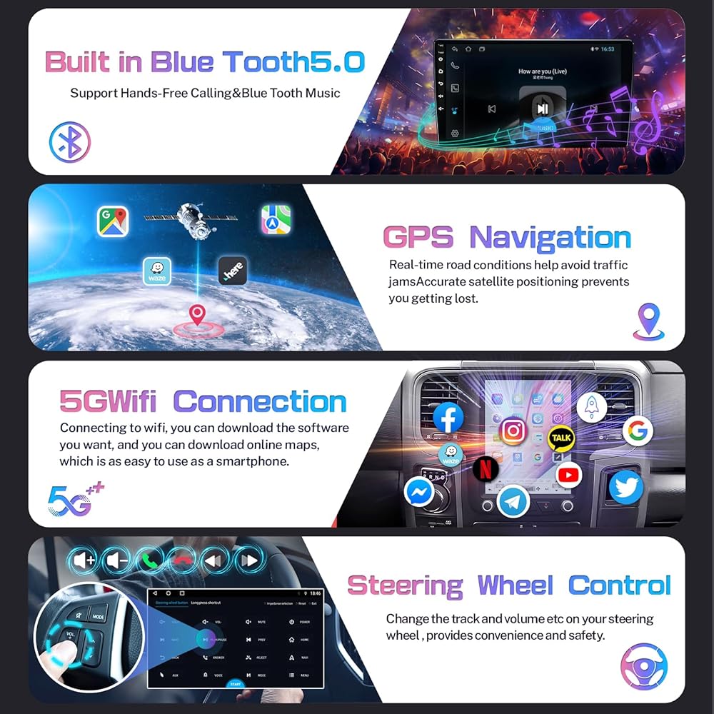 【Multi-functional car audio】: 5GWIFI, Bluetooth 5.0, IPS 1024*768 resolution screen, online/offline navigation, 48 Bands equalizer, Built in DSP, Preset 8 sound effects, Sound field adjustment, Bass boost, Steering wheel control, Mirror link, AM/FM/RDS Radio, AHD Reversing camera, Download Phone book to the radio, Variety themes, Built-in 4x45 Watt amplifier, Voice assistant, Split Screen and a variety of practical features to improve your driving!