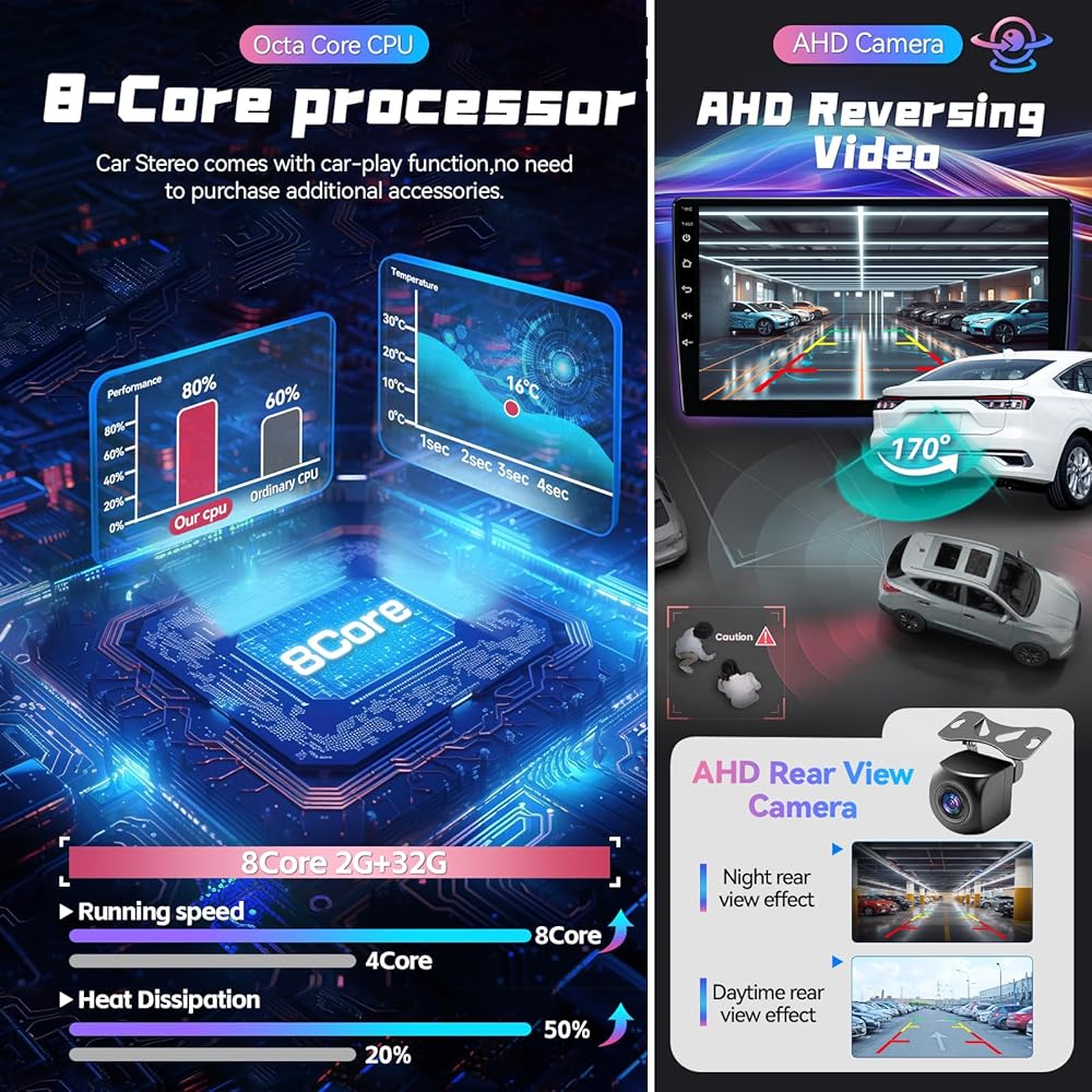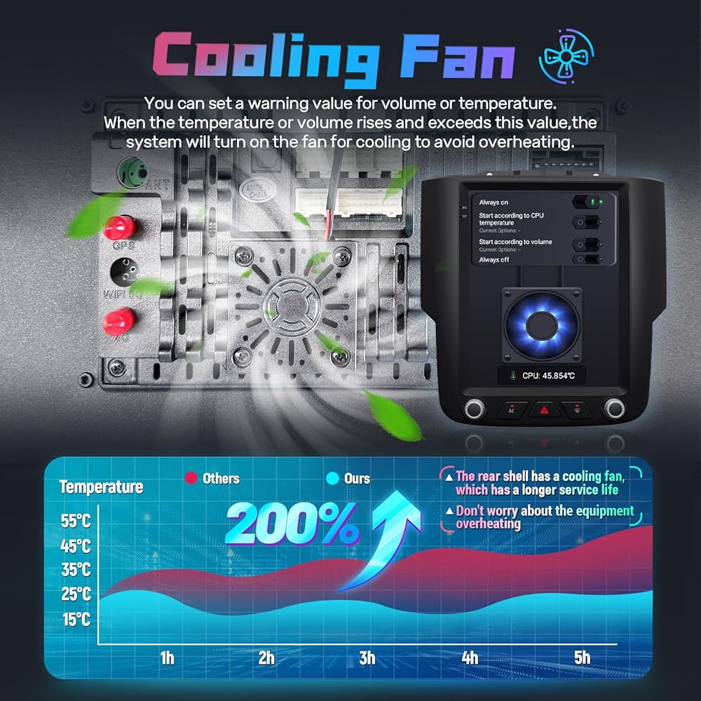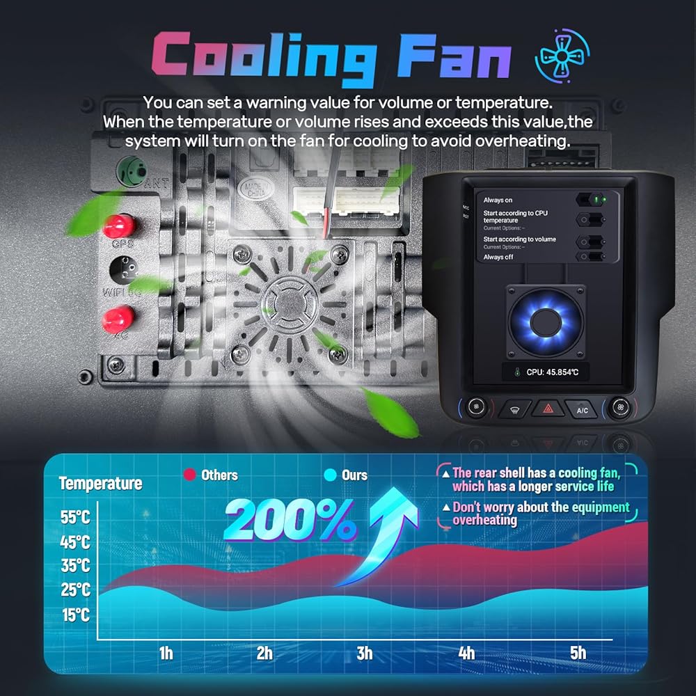 【Upgraded fan cooling system】: Car Stereo Radio uses a fan cooling system. intelligent control greatly reduces high temperatures and murmur of the radio cause by rising temperatures, avoid overheating situation to extends the service life of the machine.