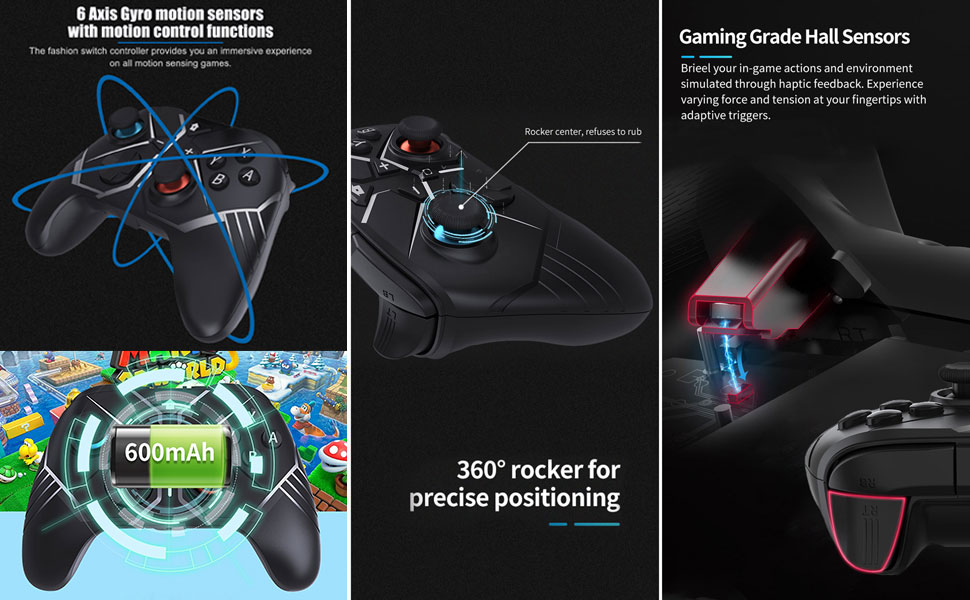 The wireless controller built-in 6-axis gyro and double-shock function , support motion sensing function and screen capture function. 360° rocker for precise positioning. Brieel your in-game actions and environment simulated through haptic feedback, experience varying force and tension at your fingertips with adaptive triggers. Enhance your game experience.