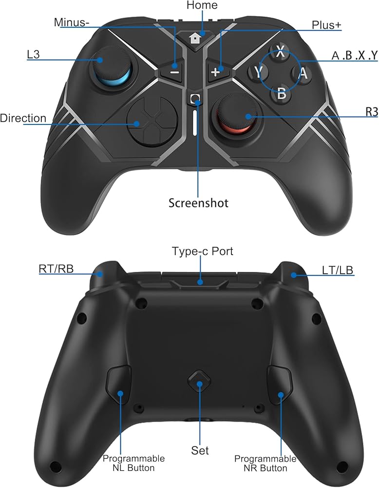 Progammable function for switch controllers: The game controller with action buttons: cross buttons (up, down, left and right), ABXY, L/R/ZL/ZR/L3/R3 . Program button: NL/NR/SET.