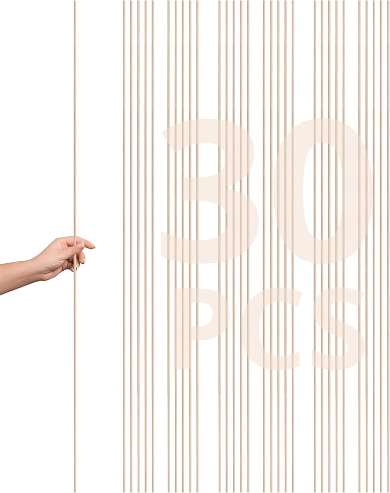 Long dowel rods package includes 30 pcs bamboo rods for crafts and DIY projects. Ideal choice if you want some extra length. These long dowels are perfect when you need long sticks for crafting, roasting marshmallows, making kites, flags, macrame, various wood crafts