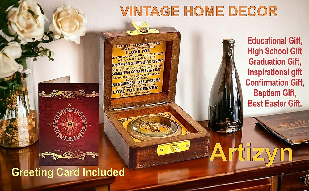 to My Grandson Brass Compass with Wooden Box Mom to Son Compass, Father to Son Gifts, Graduation Day Gifts, Baptism, Confirmation & Communion for Men & Women, Greeting Card Included
