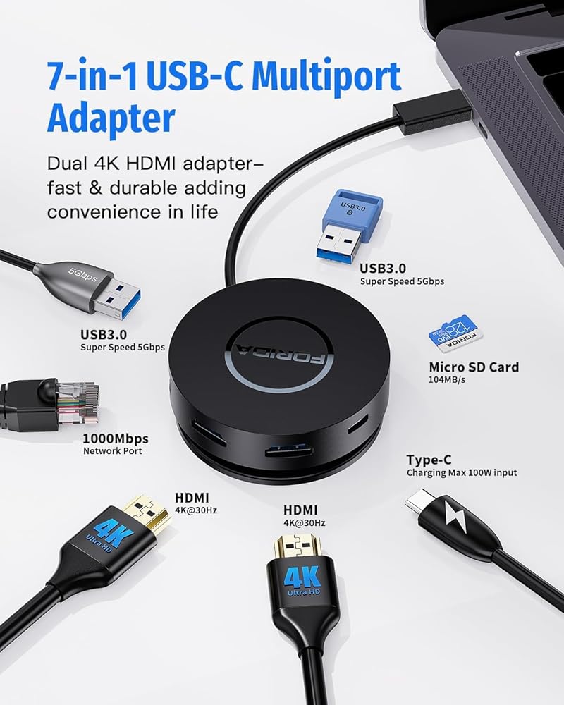 7 IN 1 Docking Station- PD charging port, Gigabit RJ45 Port, 2 x 4K HDMI ports, Micro SD Card Slot, 2 x super speed USB 3.0 Ports(Up to 5Gbps), Portable design, Plug, and Play. As a new content of powerful USB C docking station.