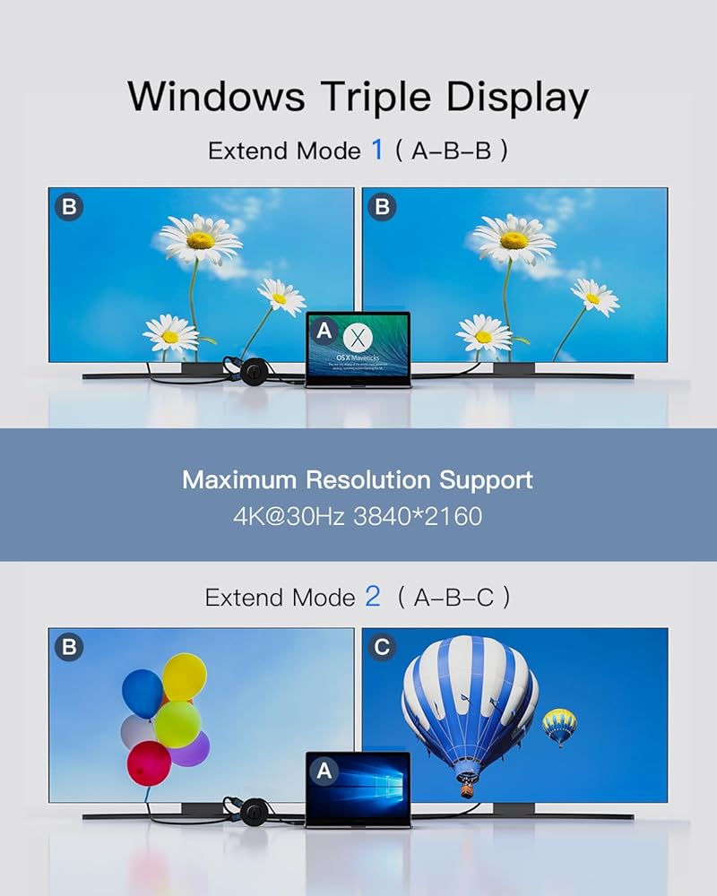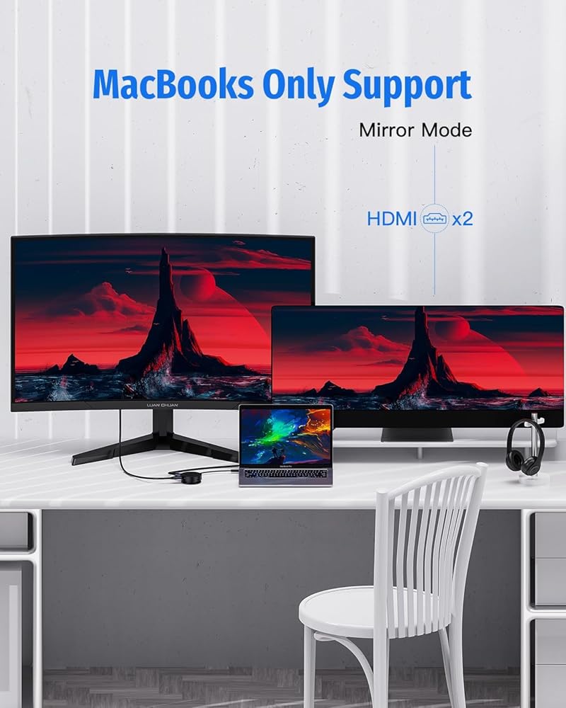 DOUAL DISPLAY DOCKING STATION- Simply connect docking station with the HDMI port and you can enjoy Ultra HD audio instantly(Single Display Up to 4K@30Hz). Hdmi splitter for dual monitors support mirror or extend mode with crystal clear 3D visual and high quality video experience through 2 HDMI ports. You can do different project on different monitors which provide you more space for work, good for home office.