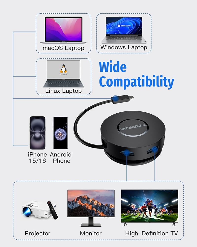 LEADING TECHNOLOGY- FORIDA intelligent USB C HUB has perfectly combined the function of USB c hub and docking station, Our USB C hub incorporates a DOUAL display, lightweight,portable and powerful with multi-ports to achieve multi-display (Mirror Mode/Extend Mode)refine you a new concept of USB C HUB.