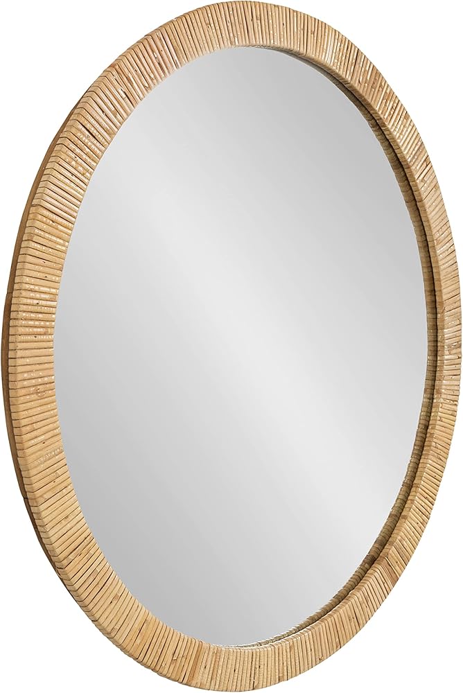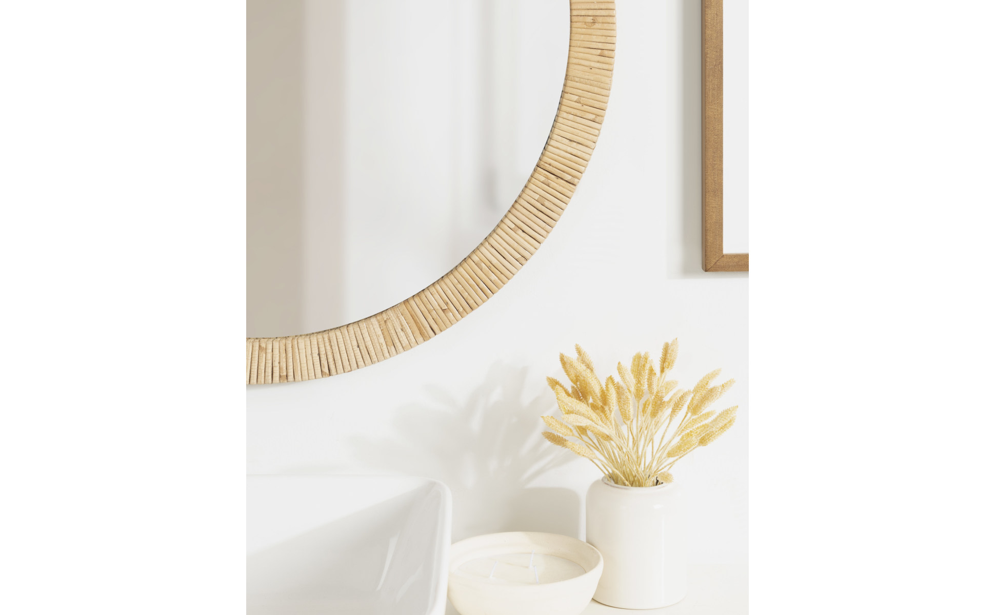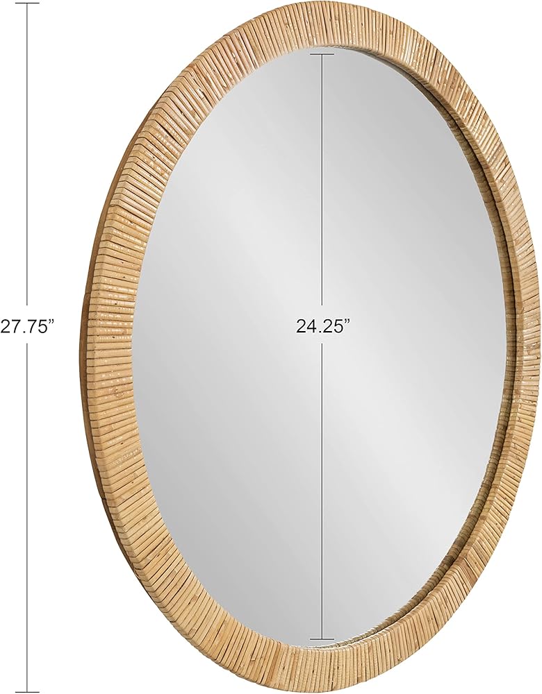 Create a bohemian aesthetic in your home with this fantastic and oversized Rahfy mirror. This beautiful mirror is the epitome of boho design, featuring a round, textured look on the frame that pops off the wall. The beautifully wrapped frame is made from premium, high-quality rattan with a natural wood finish to show off its rich, authentic look. The round shape emphasizes its unique look with a dash of modernity to showcase a geometric and trendy style on any wall. The Rahfy mirror has a 28-inch diameter and a 1.25-inch profile, giving it a great dimensionality that pops off the wall. The actual glass mirror is 24.25 inches in diameter, providing an accent piece that is lovely for adding vibrancy and openness to any room of your home. Hang this stunning piece of wall decor in your bedroom, entryway, dining room, living room, or even bathroom with its stellar and unique boho design. Hang the beautiful and awe-striking Rahfy wall mirror in a matter of minutes with the convenient D-ring hangers attached to the back of the frame.